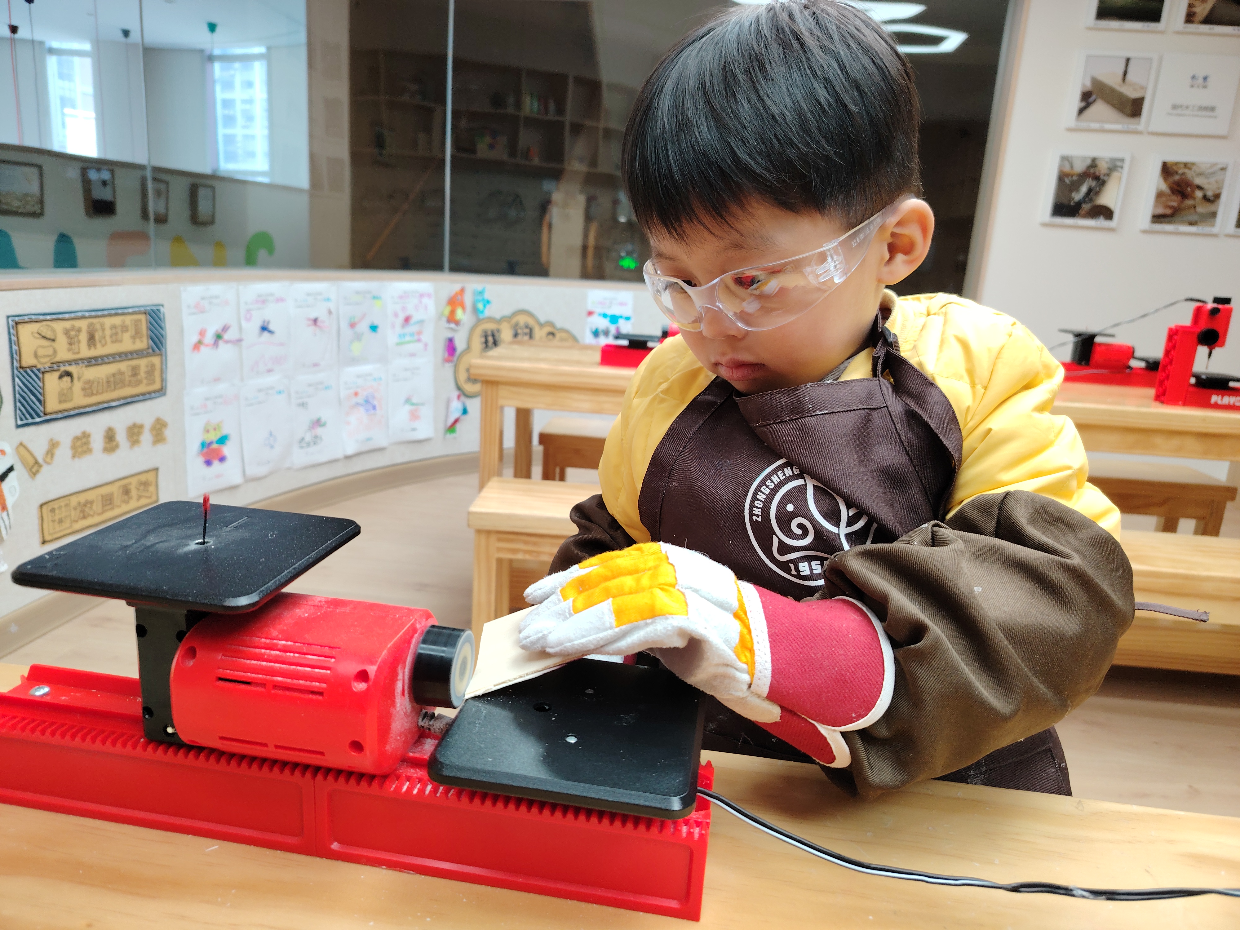 幼儿园的创客工坊以木为载体,清新的原木色,为儿童创设一个源于自然的、充满艺术气息的操作环境,让儿童在动手操作的过程中,学会刨削、锯割、开榫等技能,体验木工手作的技艺美,感受非遗木工的魅力。