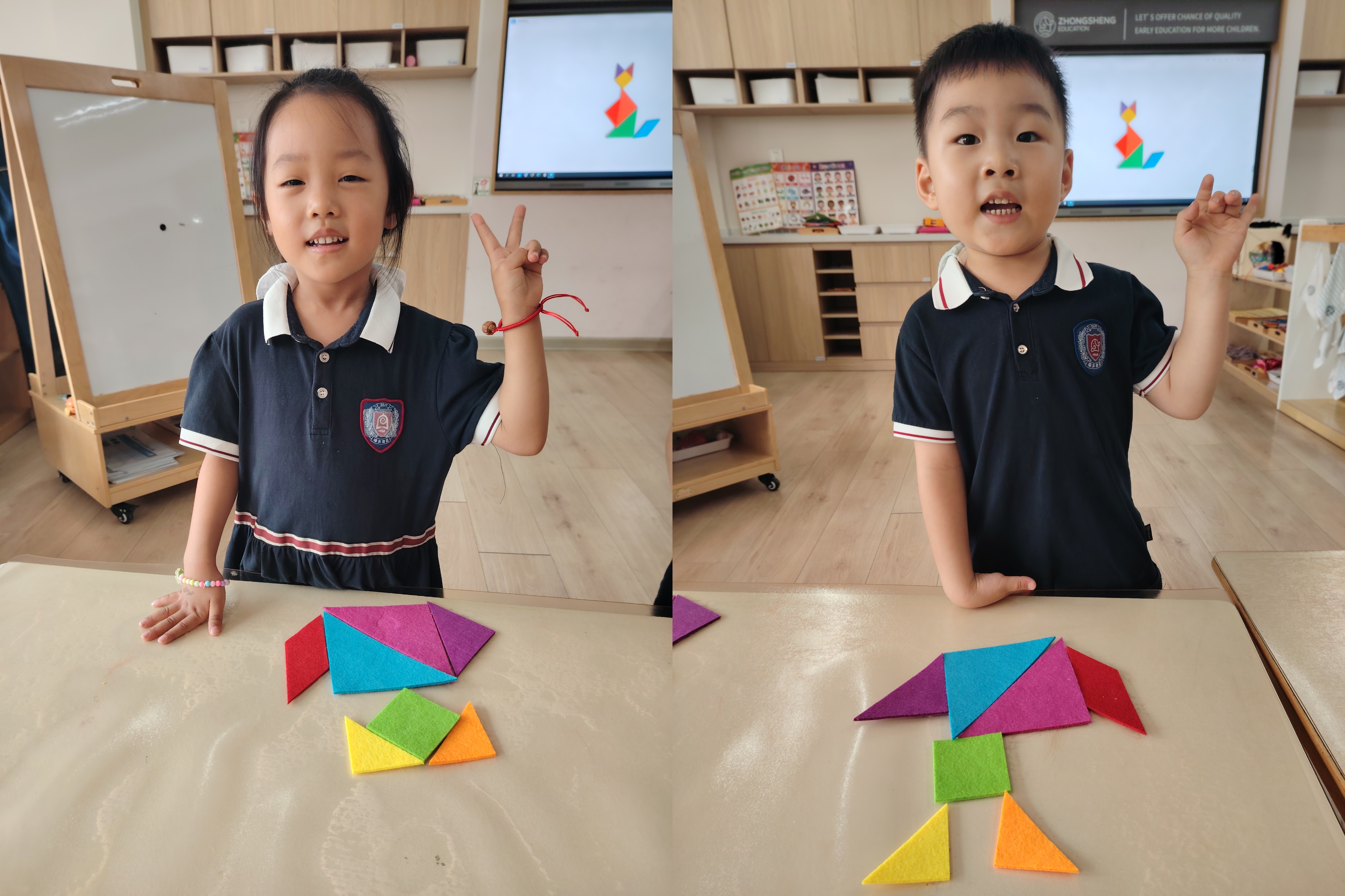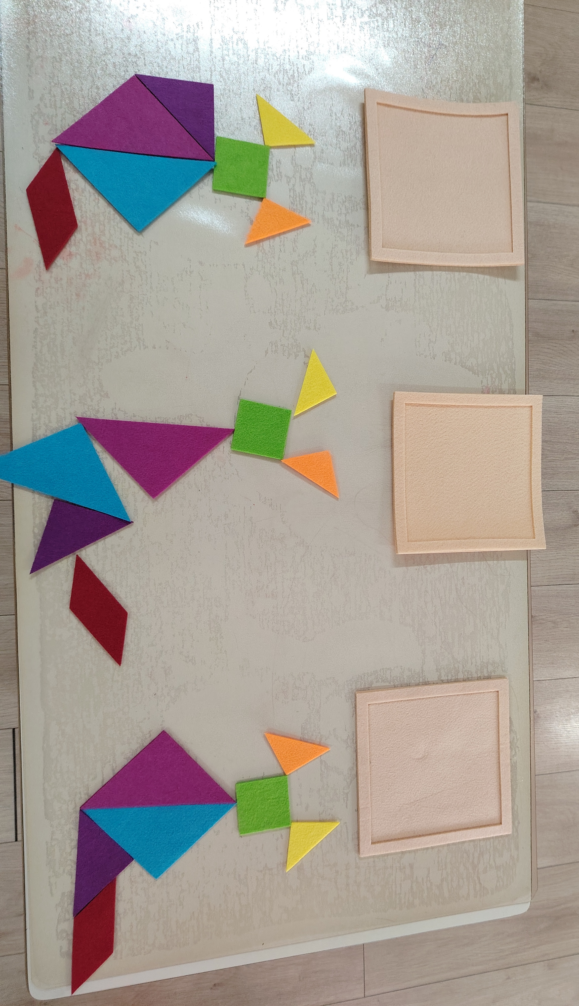 今天我们的数学小课堂带着宝贝们一起用七巧板拼玩小狐狸,快看!跑,跳,爬 ,蹲 ,立的小狐狸它们来了。