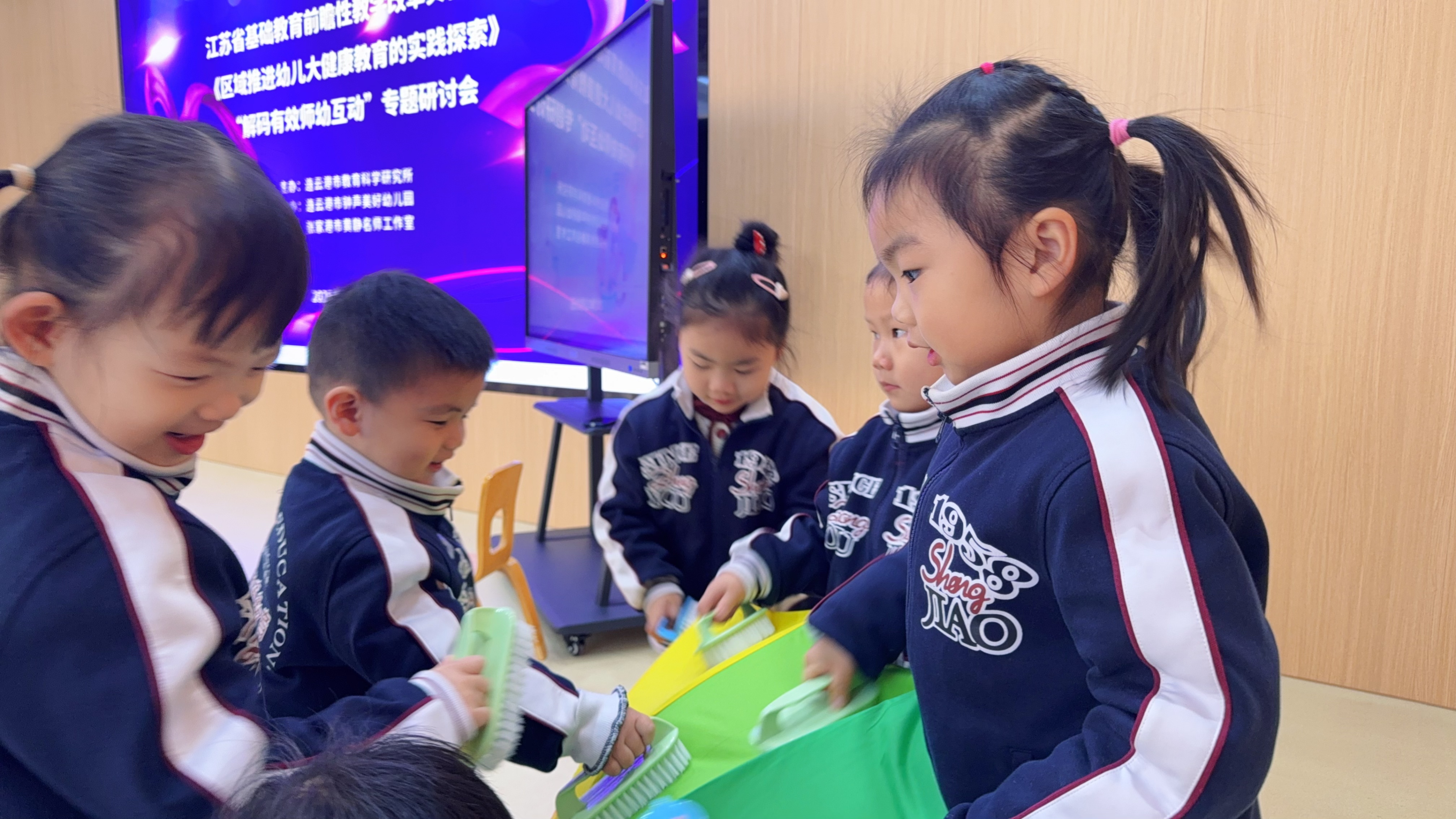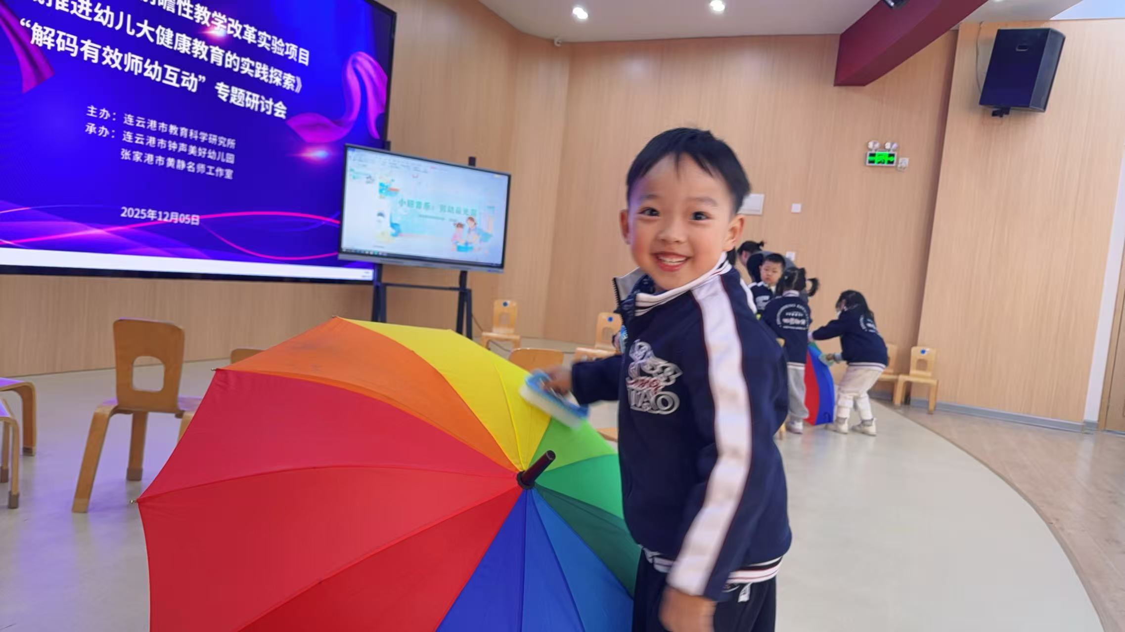 镜头先捕捉到那个正在刷彩虹伞的小男孩——他仰着笑盈盈的脸,伞面红橙黄绿蓝的色彩漫过镜头,连空气都染上了甜津津的活泼。这是“推进幼儿大健康教育的实践探索”解码有效师幼互动专题研讨会“的现场,12月5日的阳光透过玻璃,将木质小椅子、远处的同伴身影,连同孩子们眼里