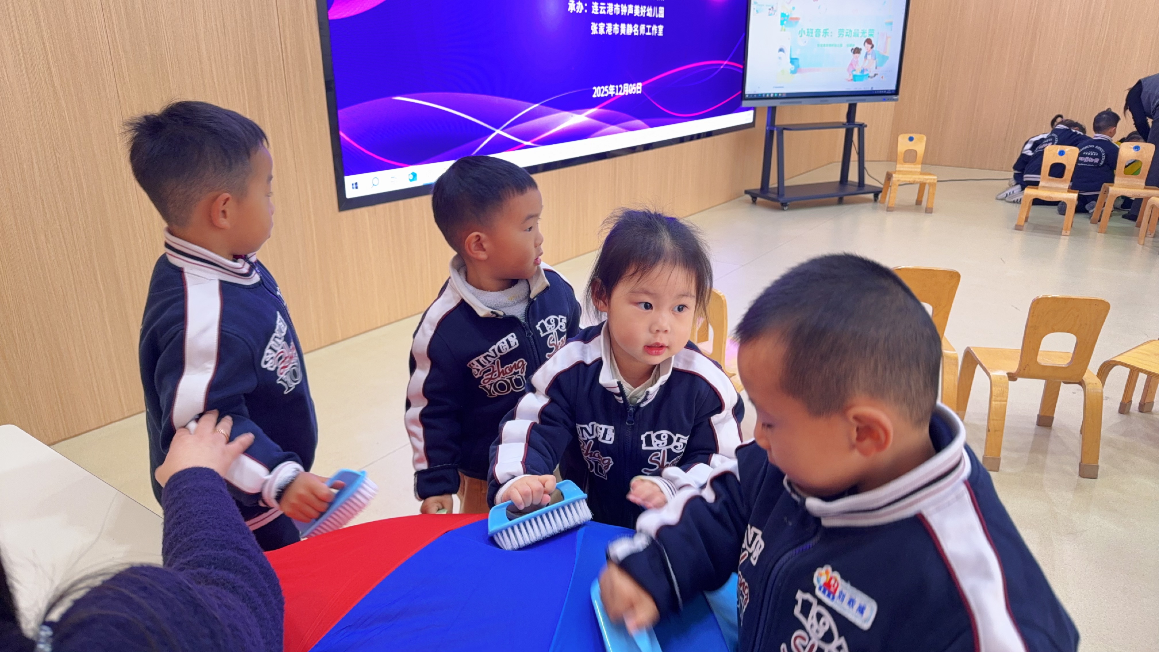 十二月的风裹着暖意钻进连云港市钟声美好幼儿园的窗棂,多功能厅里正流淌着特别的旋律——不是单纯的琴瑟叮咚,而是刷子轻扫桌面的沙沙声、孩子们的笑声,与《劳动最光荣》的歌声交织成一曲鲜活的成长乐章。这场名为“劳动最光荣”的小班音乐课,用最本真的模样,解码了师幼互动里藏着的教育密码。