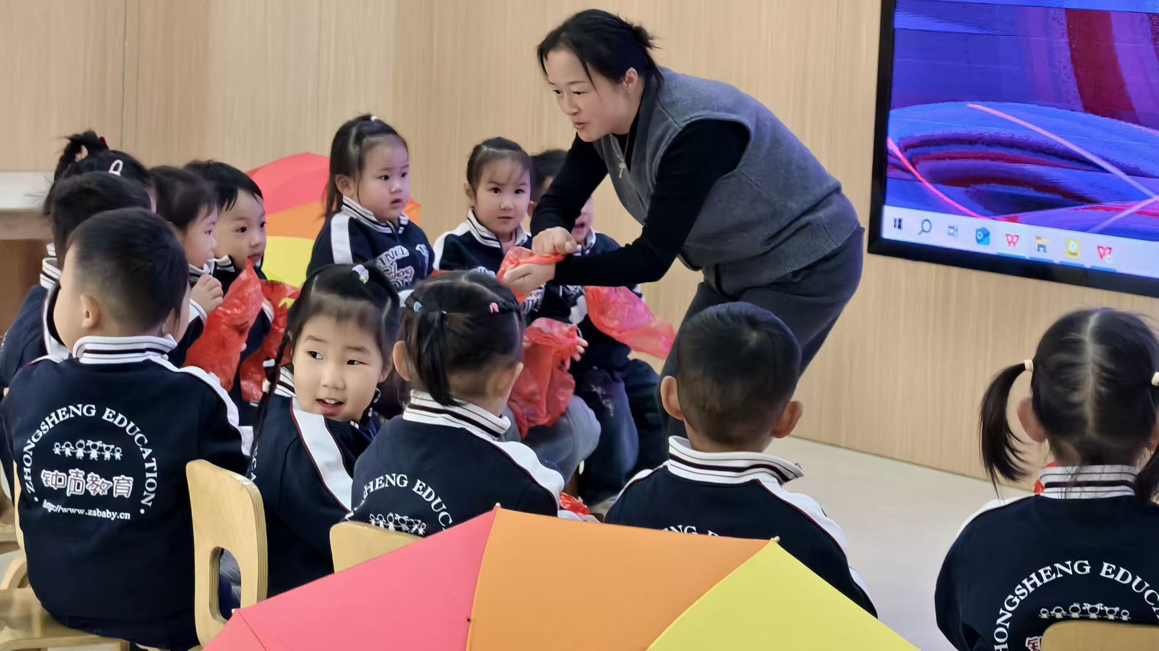硬的“指令”,只有“对话”——当孩子举着刷子不知所措时,老师会说“你试试这样拿,会不会更省力?”;当彩虹伞被擦得发亮时,老师会拉着孩子的手转个圈:“看,我们的伞在唱歌呢!”