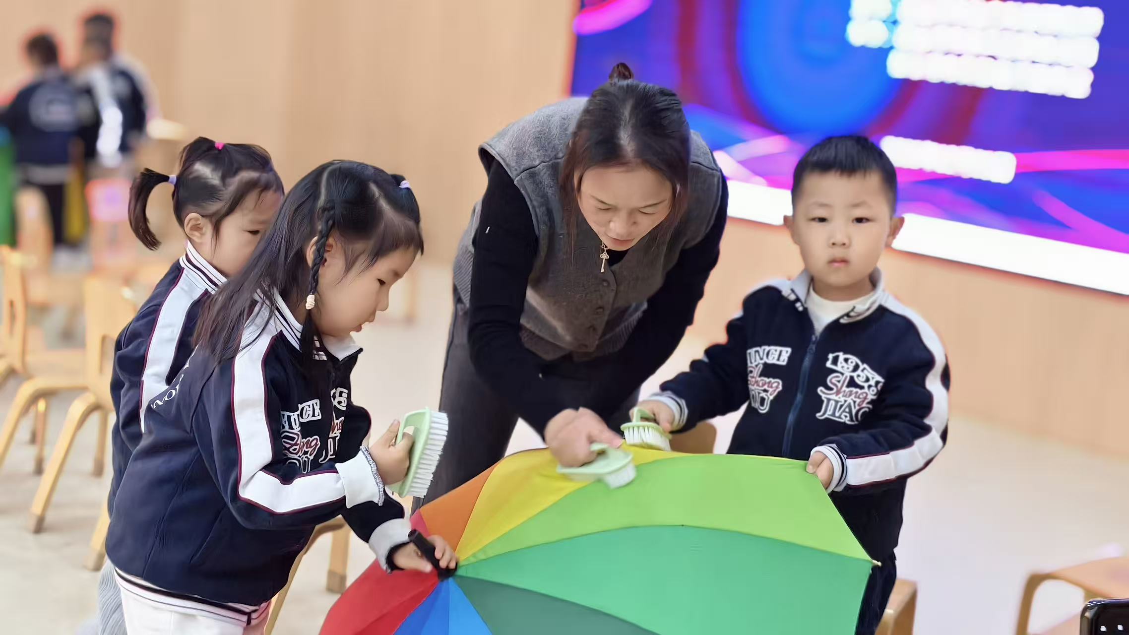 在这组镜头里,老师弯着腰和三个小朋友一起擦拭彩虹伞。她的动作慢而稳,孩子们的小刷子跟着她的节奏起落,红橙黄绿的伞面渐渐亮得耀眼。“原来劳动不是任务,是和老师一起把漂亮的东西变回