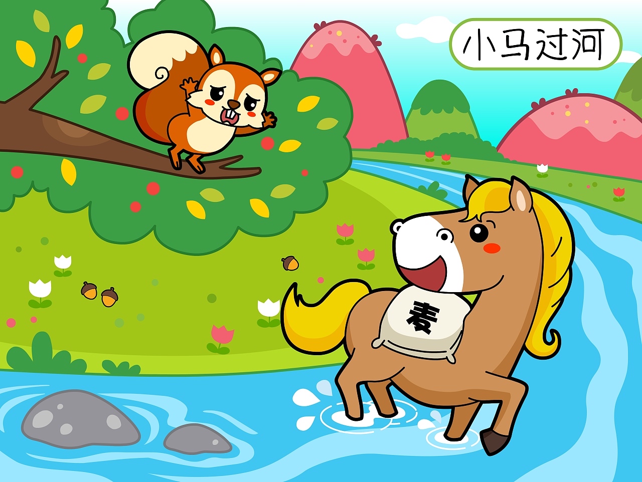 小马听了妈妈的话明白了,转身又往河边跑去。到了河边,小马刚要下水,松鼠又大叫起来。怎么,你不要命了,让我试试吧。小马一边回答,一边下了河,小心地趟了过去。