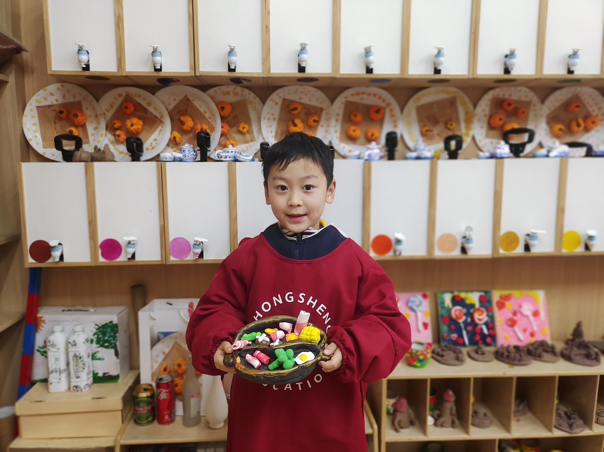 在他们的小手里,粘土变成了充满生命力的小世界。这一团团色彩,是孩子们用小手一点点揉、搓、捏、压出来的,每一块颜色的搭配、每一个造型的摆放,都藏着他们独有的小想法。
