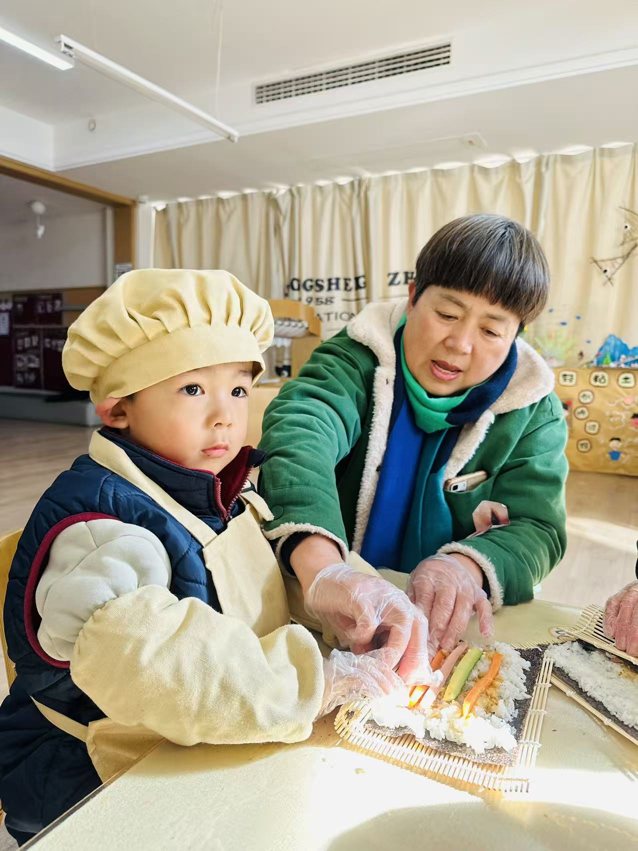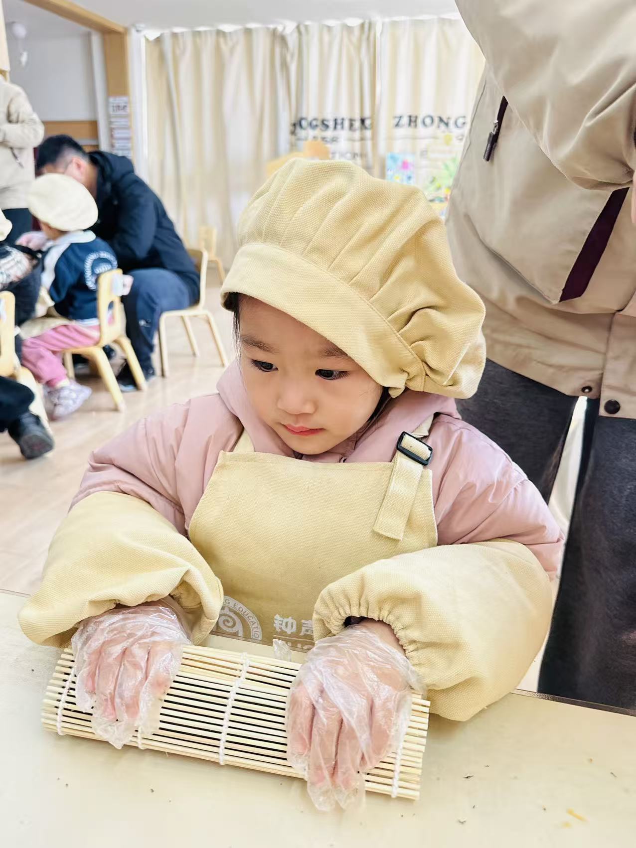在亲子烹饪区,大朋友和小朋友变成了最佳拍档。海苔、米饭、炒蛋、胡萝卜、黄瓜.…在竹帘上变成一个个香喷喷的紫菜包饭。老师耐心示范,家长细心协助,孩子们认真摆放每一粒米、每一片菜,小手与大手的温度,让美食有了爱的味道。