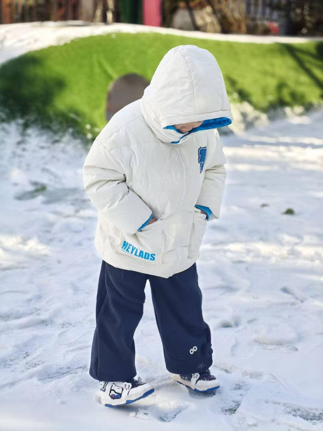 在银装素裹的幼儿园里,雪花像轻柔的羽毛,悄悄为大地披上一层洁白的梦。孩子们穿上厚厚的羽绒服,戴上暖暖的帽子,踏着咯吱作响的雪地,开启了一场属于冬天的奇妙冒险。有的小朋友弯着腰,用小铲子把雪装进红色的小桶,仿佛在建造自己的冰雪城堡;有的蹲在雪中,认真观察脚下的世界,眼里闪着好奇的光;还有的提着小桶,把雪倒在自己搭建的彩色风车上,笑声在清冷的空气里格外清脆。