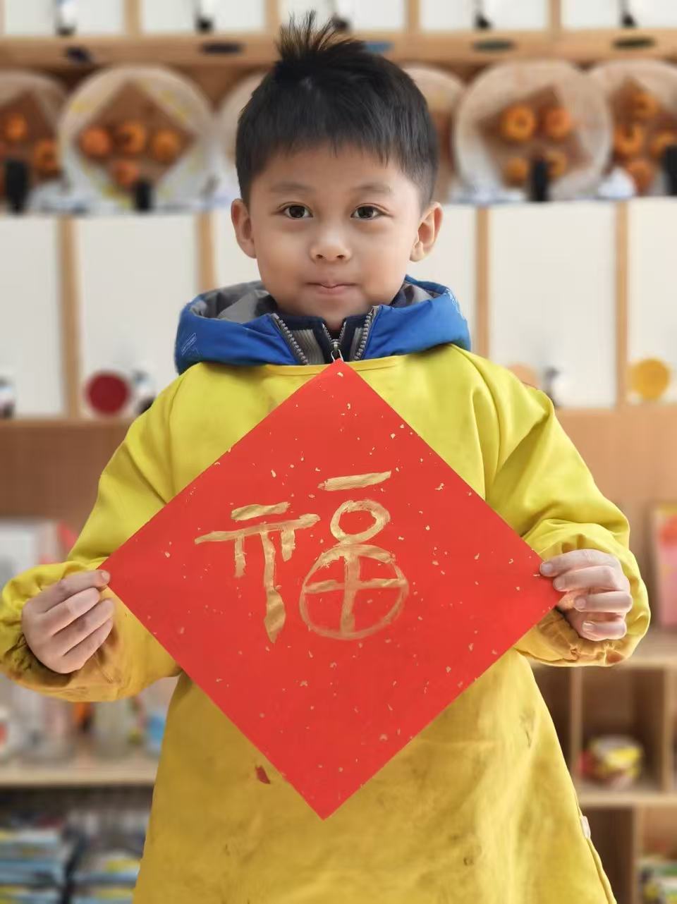 当小小的手掌握住长长的毛笔,当认真的眼神聚焦在方寸红笺上,教室里的年味儿,便在孩子们的笔尖悄悄绽放了。孩子们用难嫩的笔触,一笔一划地勾勒着“福”字。