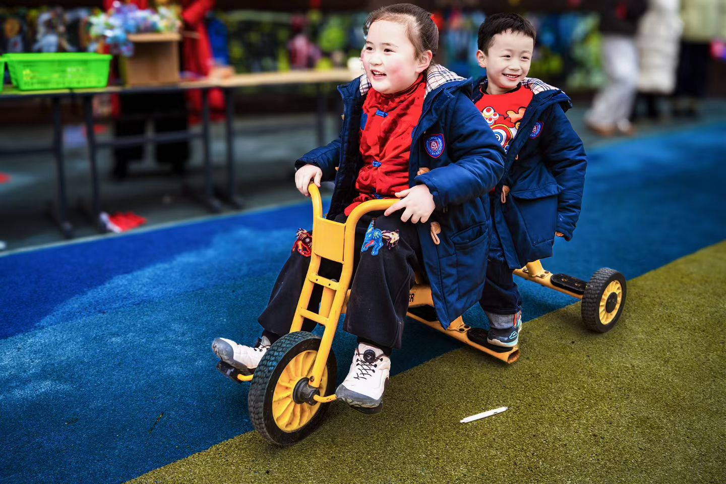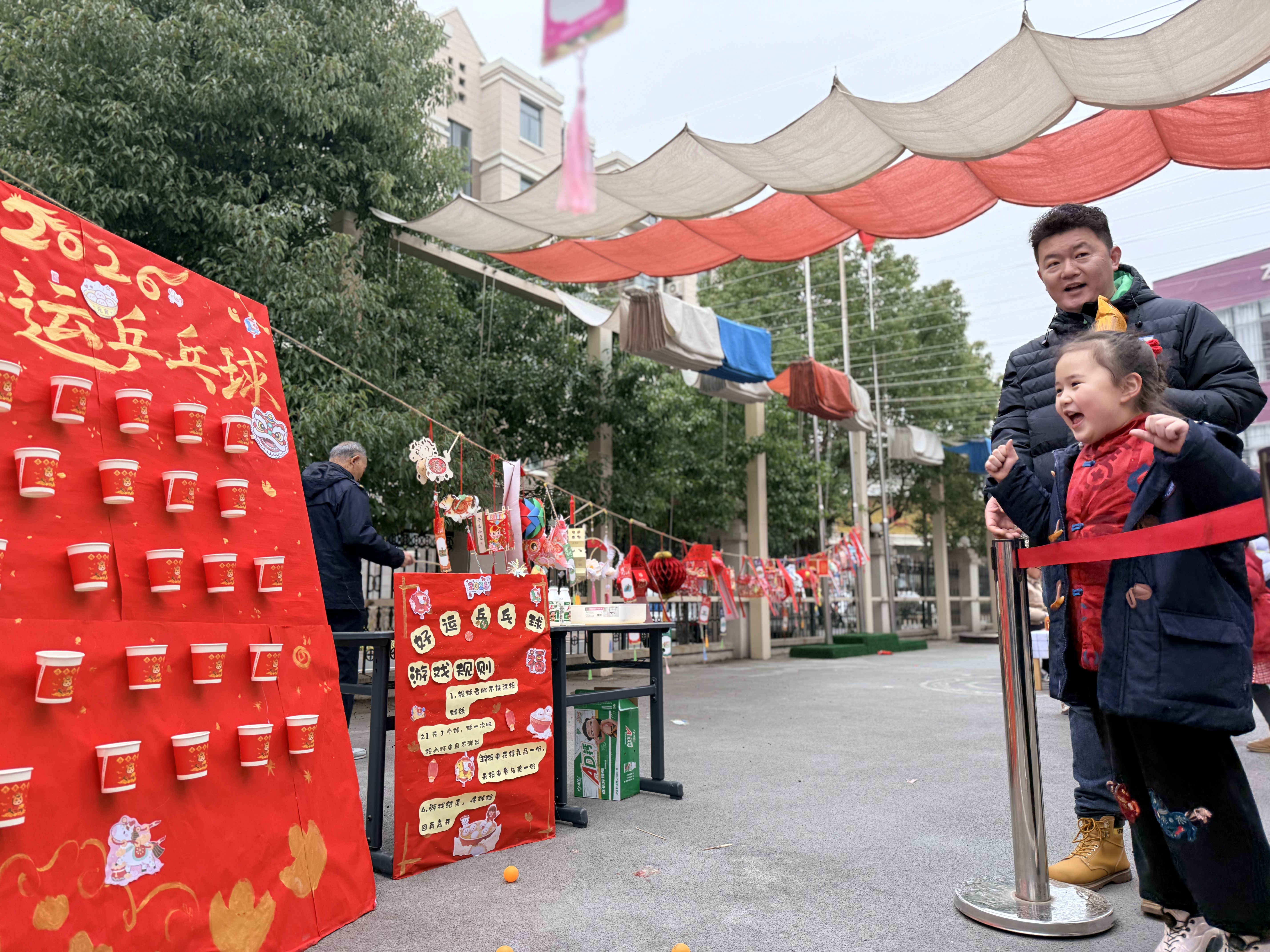“骑三轮车咯!我带小伙伴去”逛庙会’~”黄色的小三轮车成了“人气王”,孩子们轮流当“小司机”和“小乘客”,笑声追着车轮跑;还有套圈、投壶等小游戏,小小身影蹦跳着瞄准、投掷,每一个动作都写满了专注与快乐,传统的游艺项目在童真里焕发出新活力。