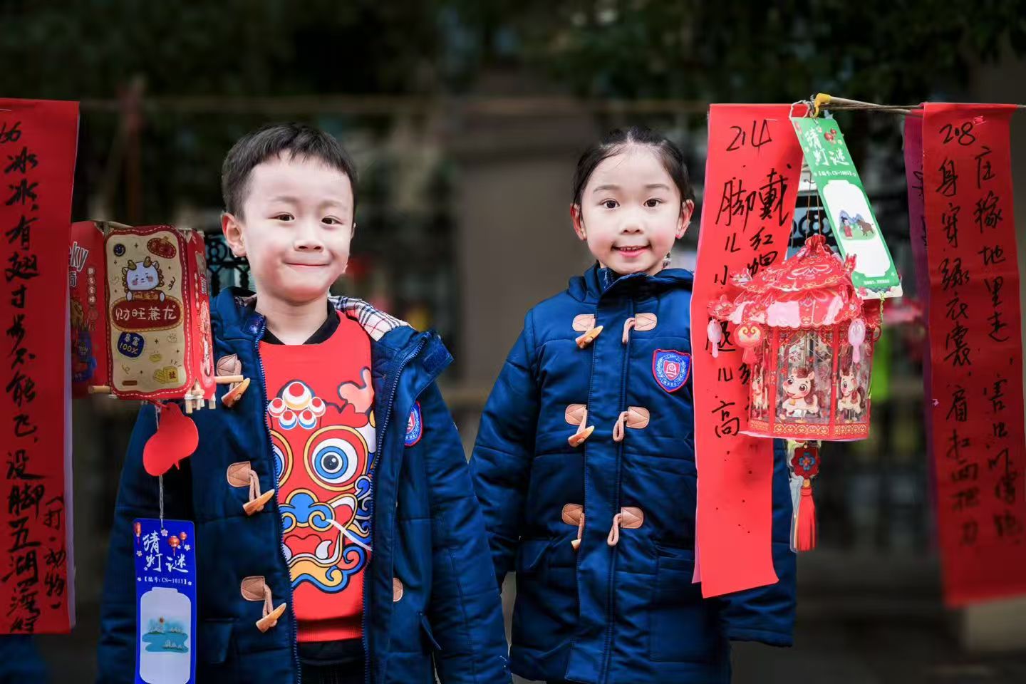 “看我的灯笼会'讲故事’!”“我的小鱼灯尾巴会摆动呢~”小手里举着的花灯,是孩子们用彩纸、画笔、黏士“编织”的童话。有的灯笼绘着萌萌的生肖,有的缀满闪闪的亮片,还有的藏着老师帮忙写的灯谜小纸条——“小小孩儿提灯游,红鞋红袜走悠悠(打一节日习俗)”,稚嫩的童声念出谜面,眼里的光比灯笼更亮~