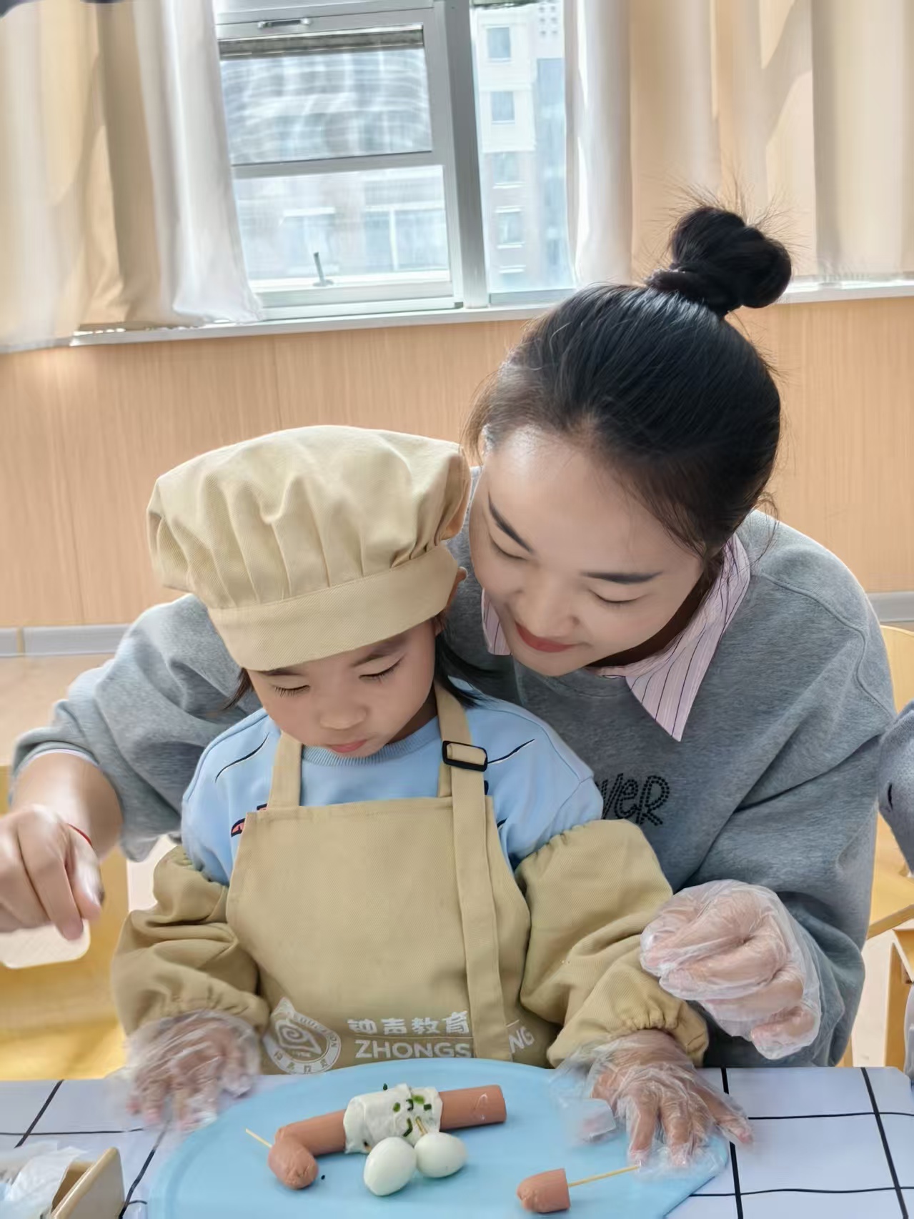 在「脆皮小蟹」亲子活动里,宝贝们化身小小烘焙师,戴上可爱的厨师帽、系上专属围裙,在爸爸妈妈的温柔陪伴下,揉面团、卷香肠、做造型,每一个步骤都充满好奇与欢喜。
