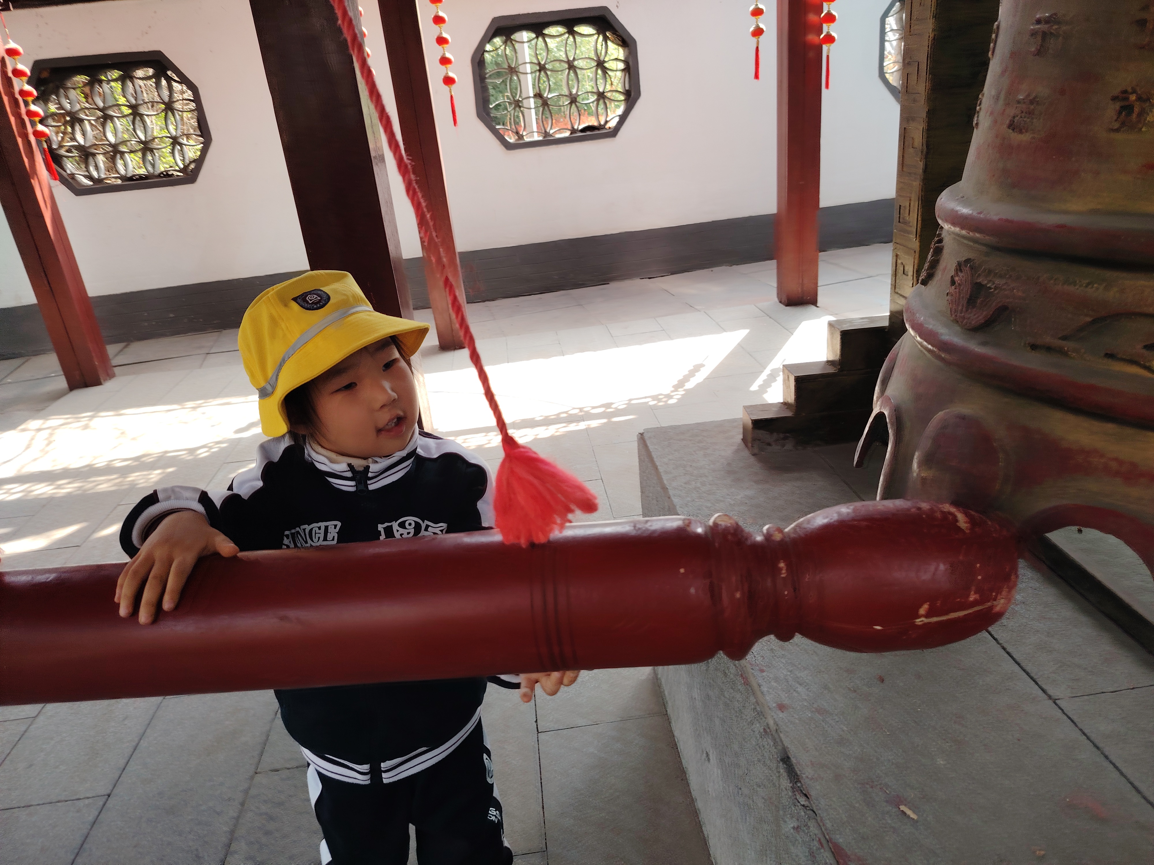 红通通的钟锤牵起红绳,“咚——”的一声,清脆的钟声回荡在庭院里。