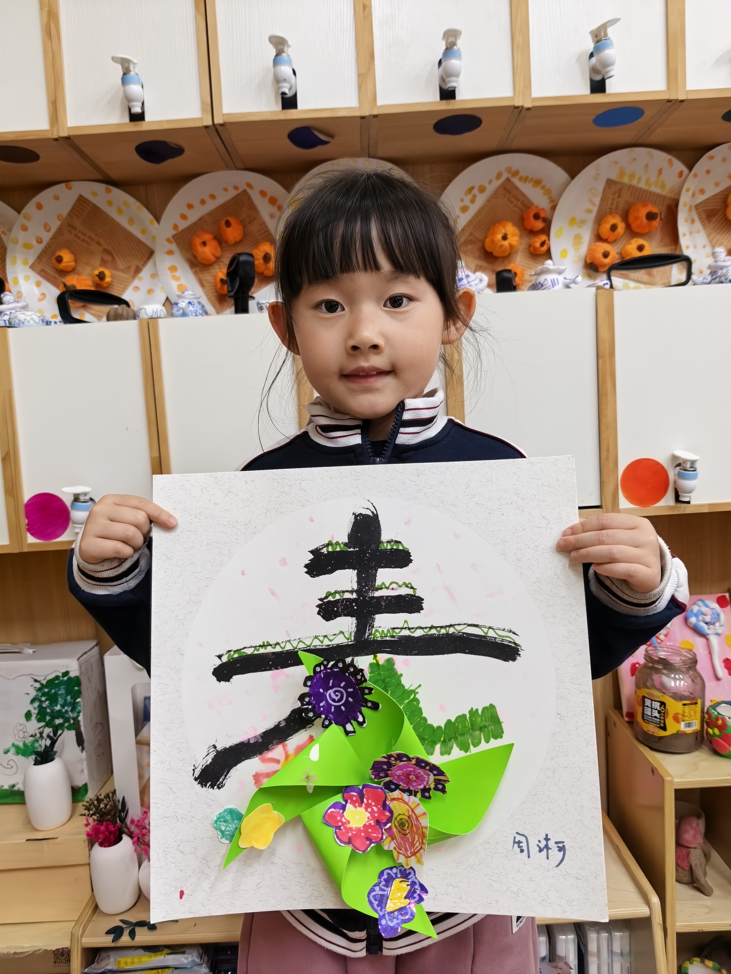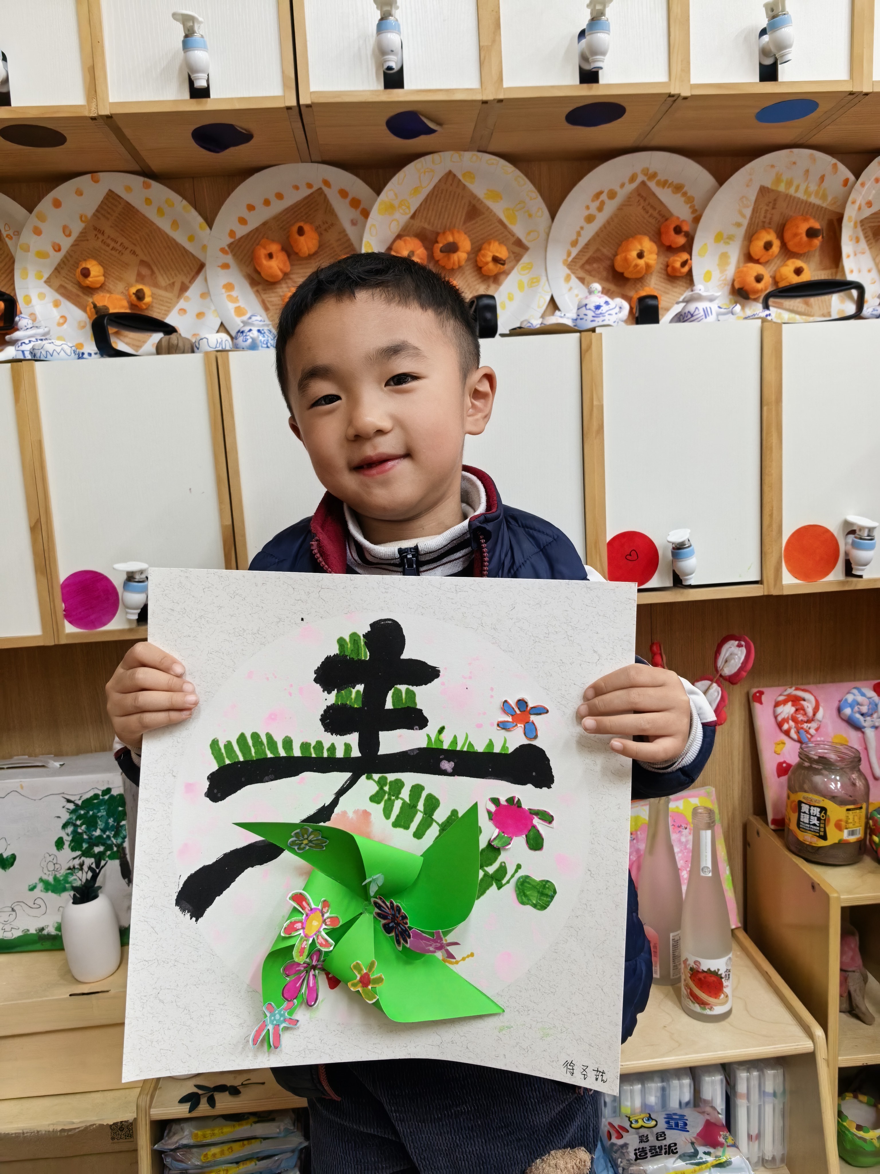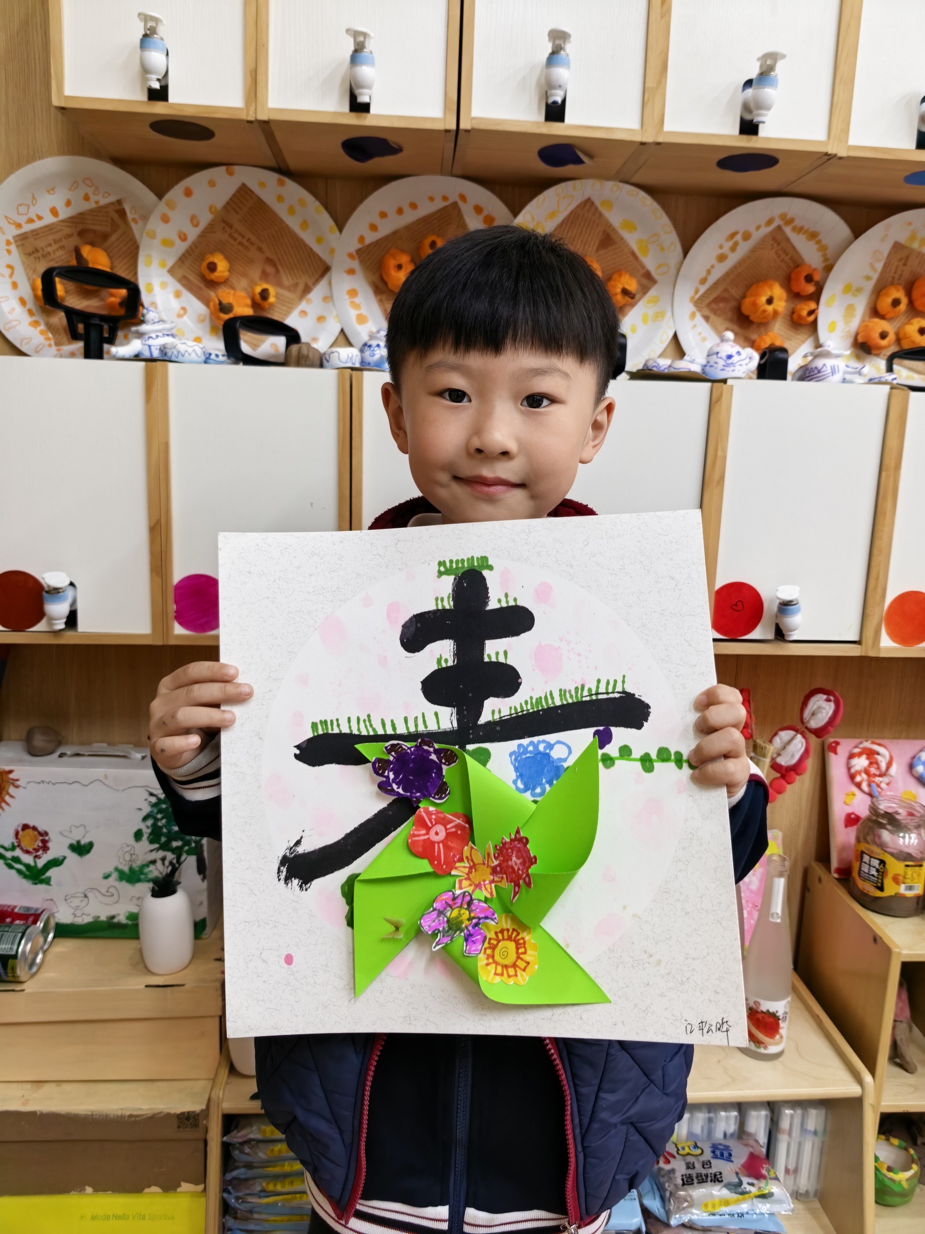 每一笔色彩,都是孩子眼里春天的模样;每一次粘贴,都是小手与创意的碰撞。有的孩子给风车缀上了五颜六色的手绘小花,紫的、红的、黄的,像把春日花园搬上了画纸;有的孩子用灵动的线条,勾勒出小草的生机,让“春”字在纸上“活”了起来。