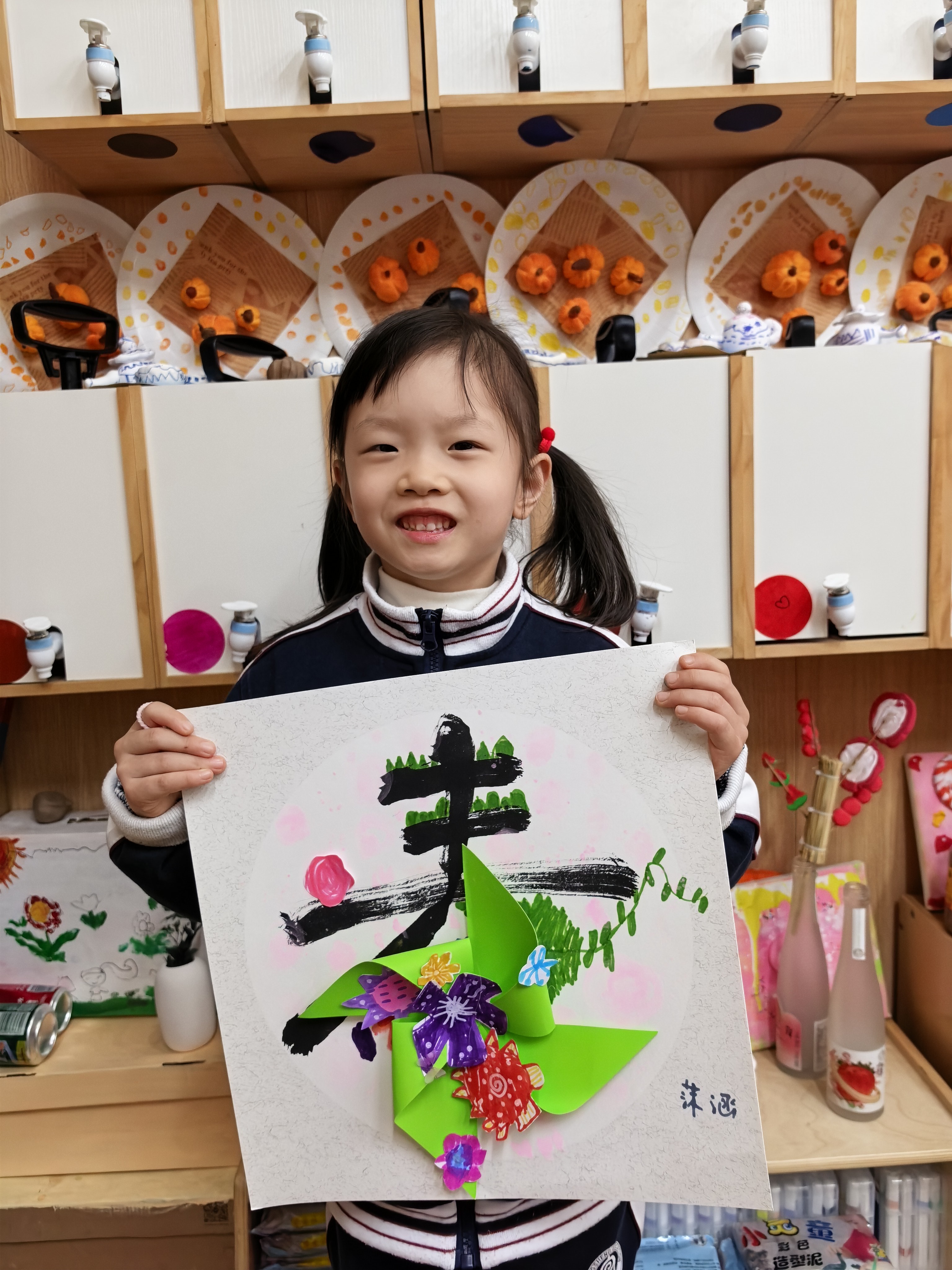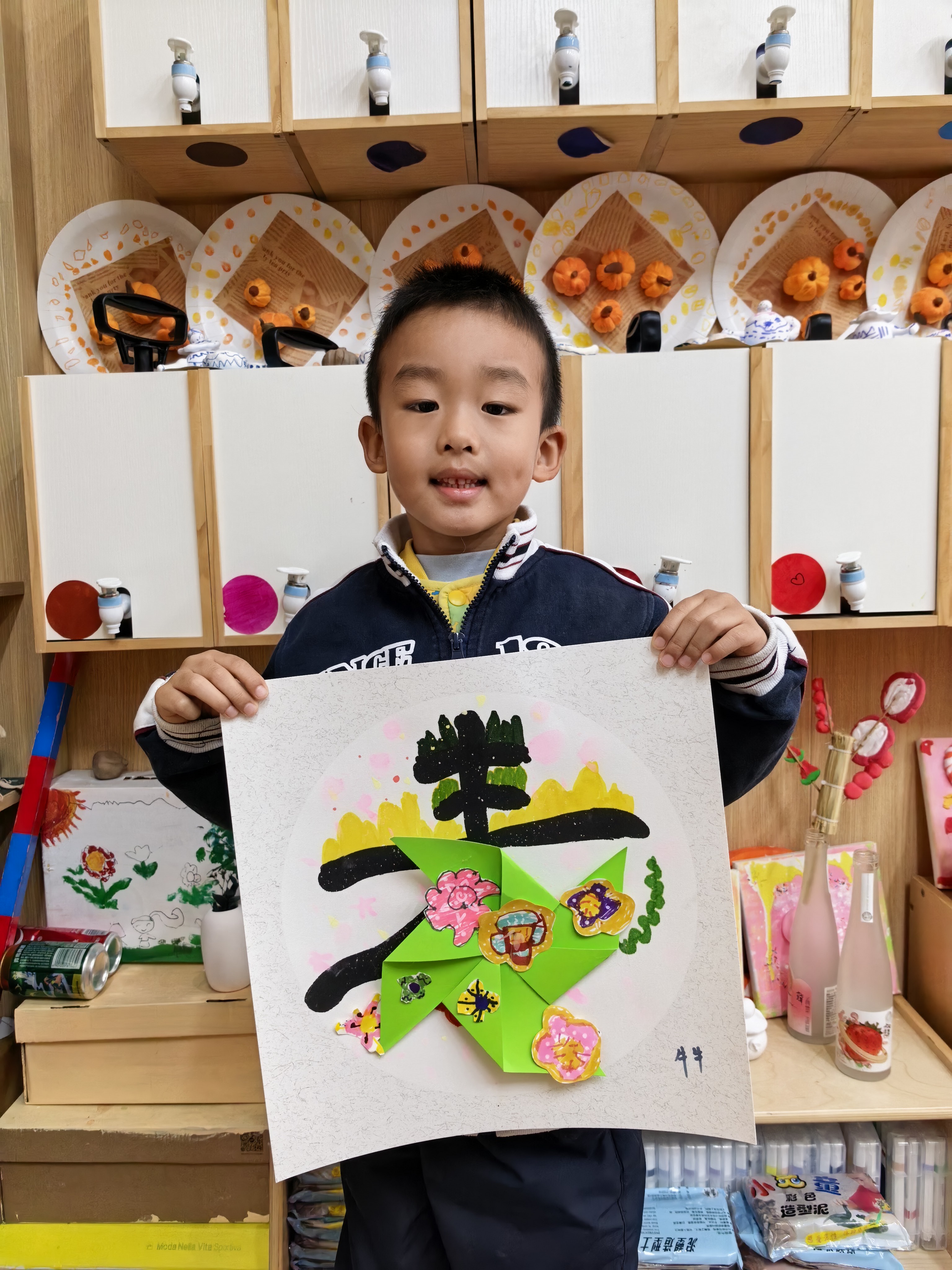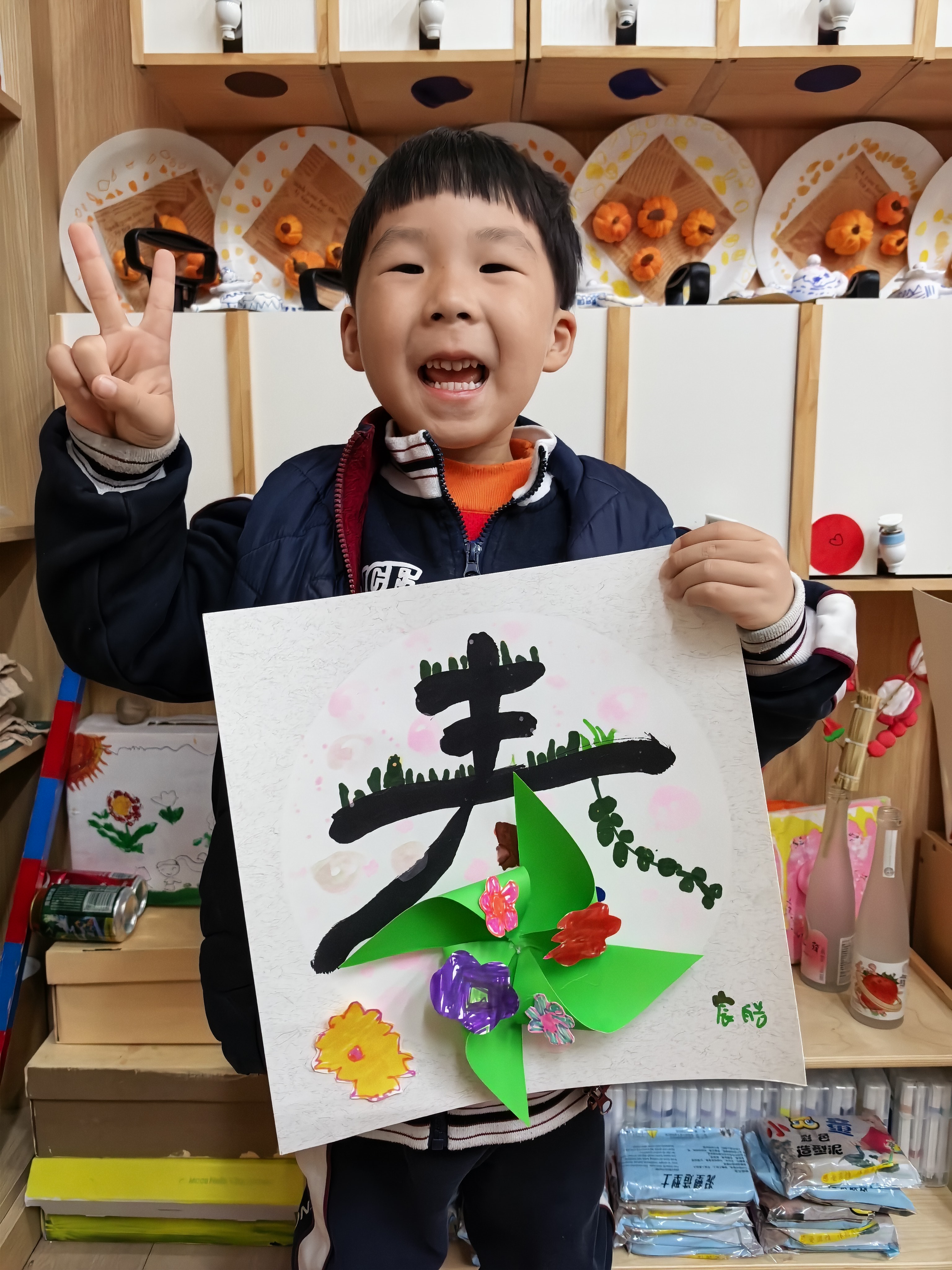 每一笔色彩,都是孩子眼里春天的模样;每一次粘贴,都是小手与创意的碰撞。有的孩子给风车缀上了五颜六色的手绘小花,紫的、红的、黄的,像把春日花园搬上了画纸;有的孩子用灵动的线条,勾勒出小草的生机,让“春”字在纸上“活”了起来。