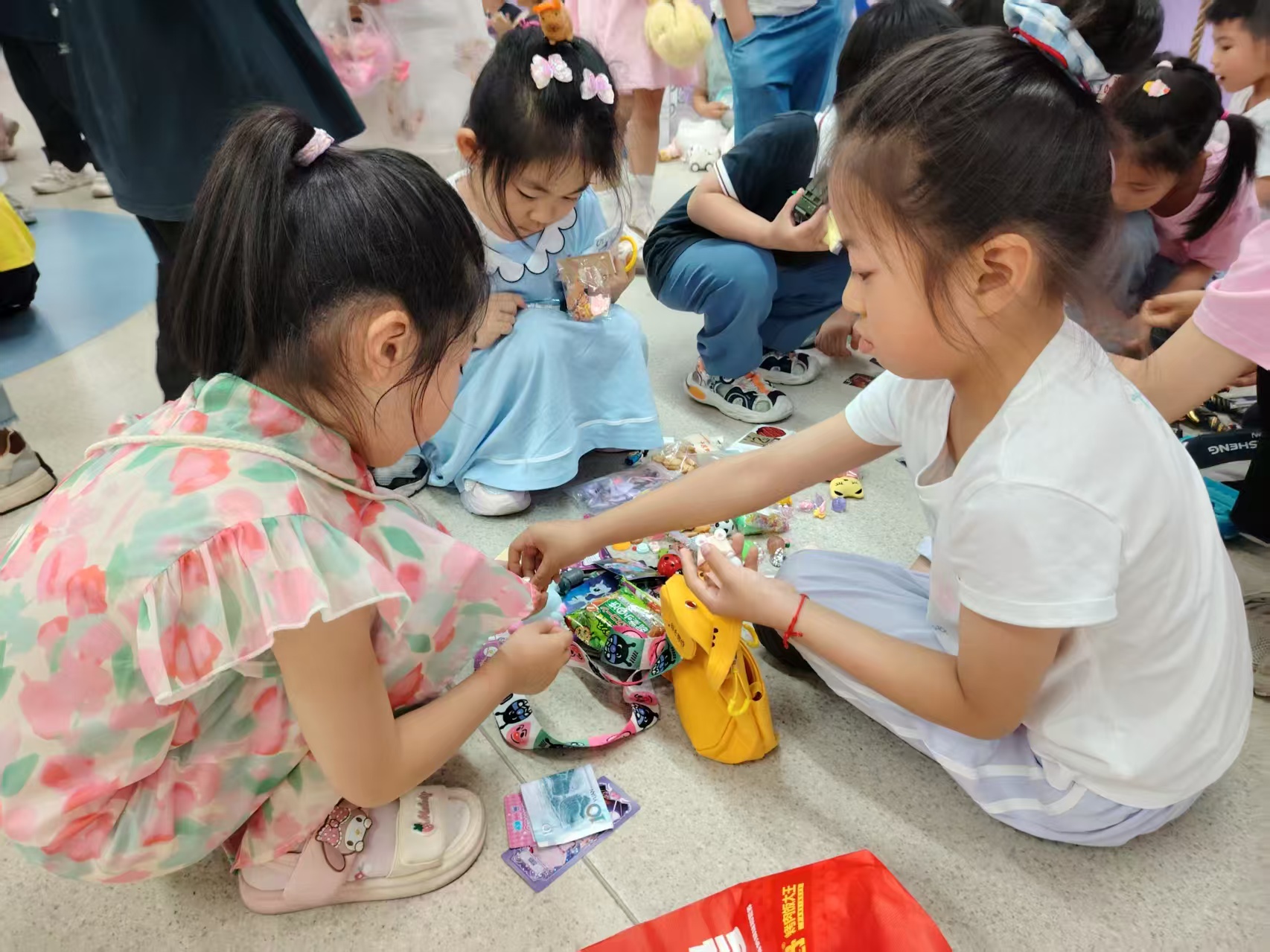 小顾客们穿梭在各个摊位之间,认真挑选自己喜欢的物品。有的蹲在摊位前仔细比较,有的拉着小伙伴商量要不要买,还有的已经迫不及待地掏出零花钱,准备“下单”。这场特别的义卖活动不仅让孩子们体验了交易的乐趣,更在他们心中播下了爱的种子。