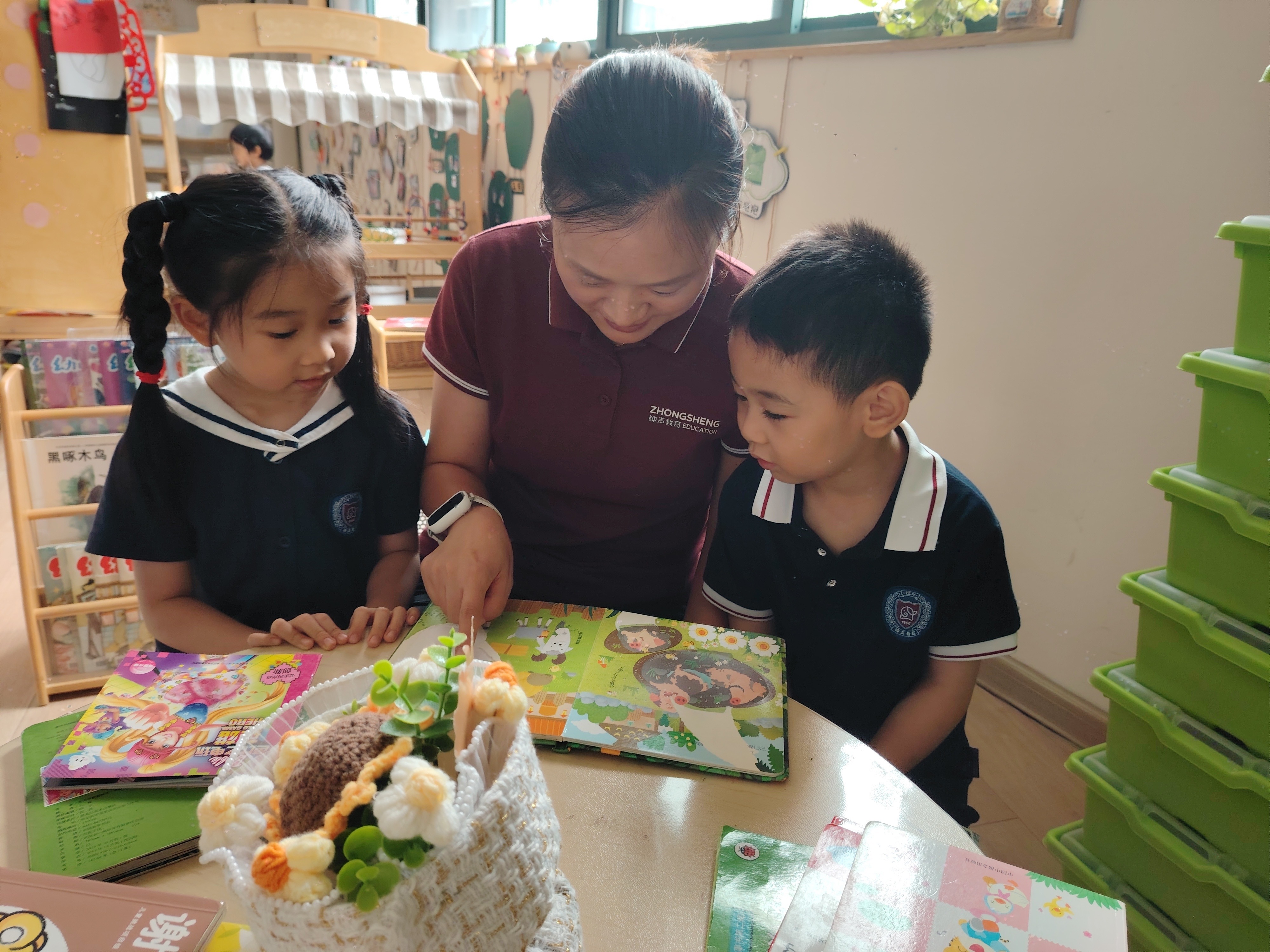 照片里的这一刻,是我日常工作的缩影。我指着绘本上的图案,两个宝贝凑在身旁,小脑袋瓜里装满了对故事的追问。那本色彩缤纷的绘本,是我们通往童话世界的钥匙;桌上的手工花束,是孩子们亲手布置的阅读小角落。每次和他们一起读绘本,我都像在和一群小探险家结伴,去发掘故事里的宝藏——他们会为小松鼠的冒险拍手,会为小熊的友谊感动,也会突然蹦出一个让我惊喜的“为什么”。