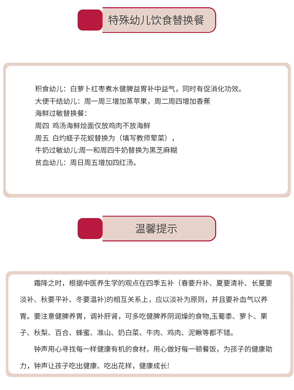 霜降之时,根据中医养生学的观点在四季五补(春要升补、夏要清补、长夏要淡补、秋要平补、冬要温补)的相互关系上,应以淡补为原则,并且要补血气以养胃。要注意健脾养胃,调补肝肾,可多吃健脾养阴润燥的食物,玉蜀黍、萝卜、栗子、秋梨、百合、蜂蜜、准山、奶白菜、牛肉、鸡肉、泥鳅等都不错。