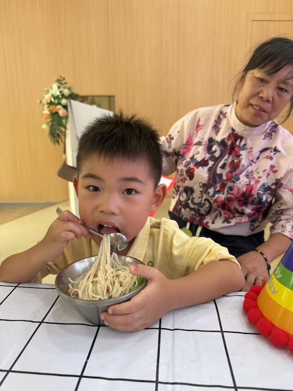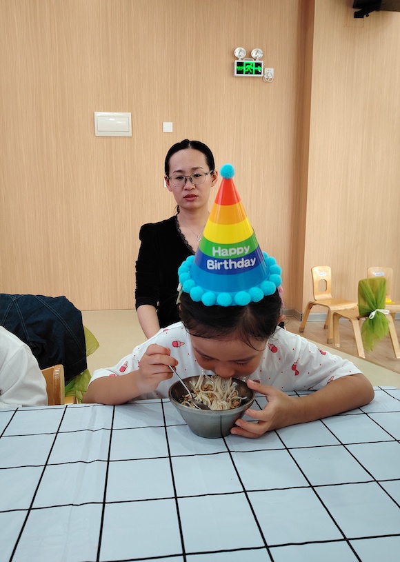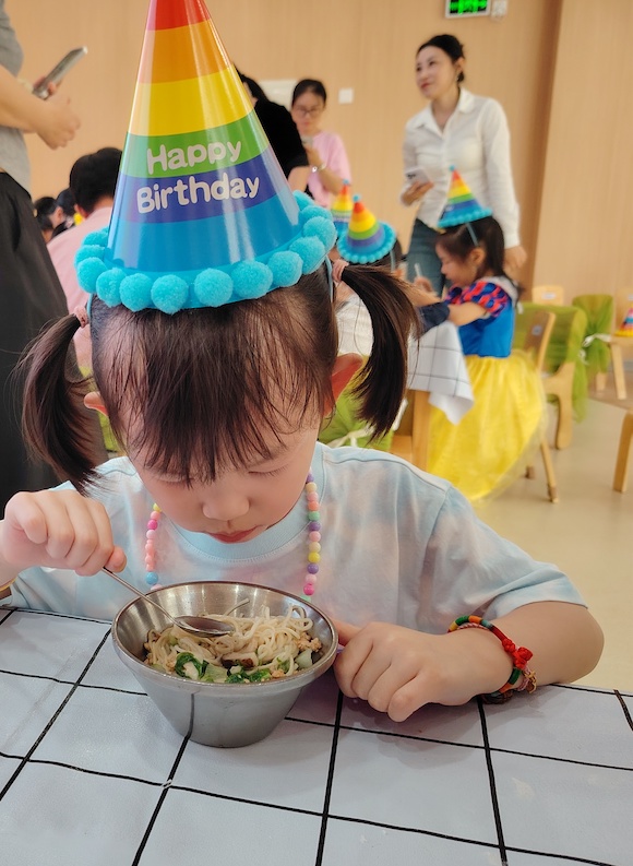 此次集体生日会我们为孩子们准备了一份特别的生日礼物——传统增岁面。老师们细心地为每个孩子端上一碗增岁面,小寿星们还不忘互相道贺:“祝你生日快乐哦!”孩子们大口大口吃得香甜,连嘴角沾到的汤汁都透着满足。