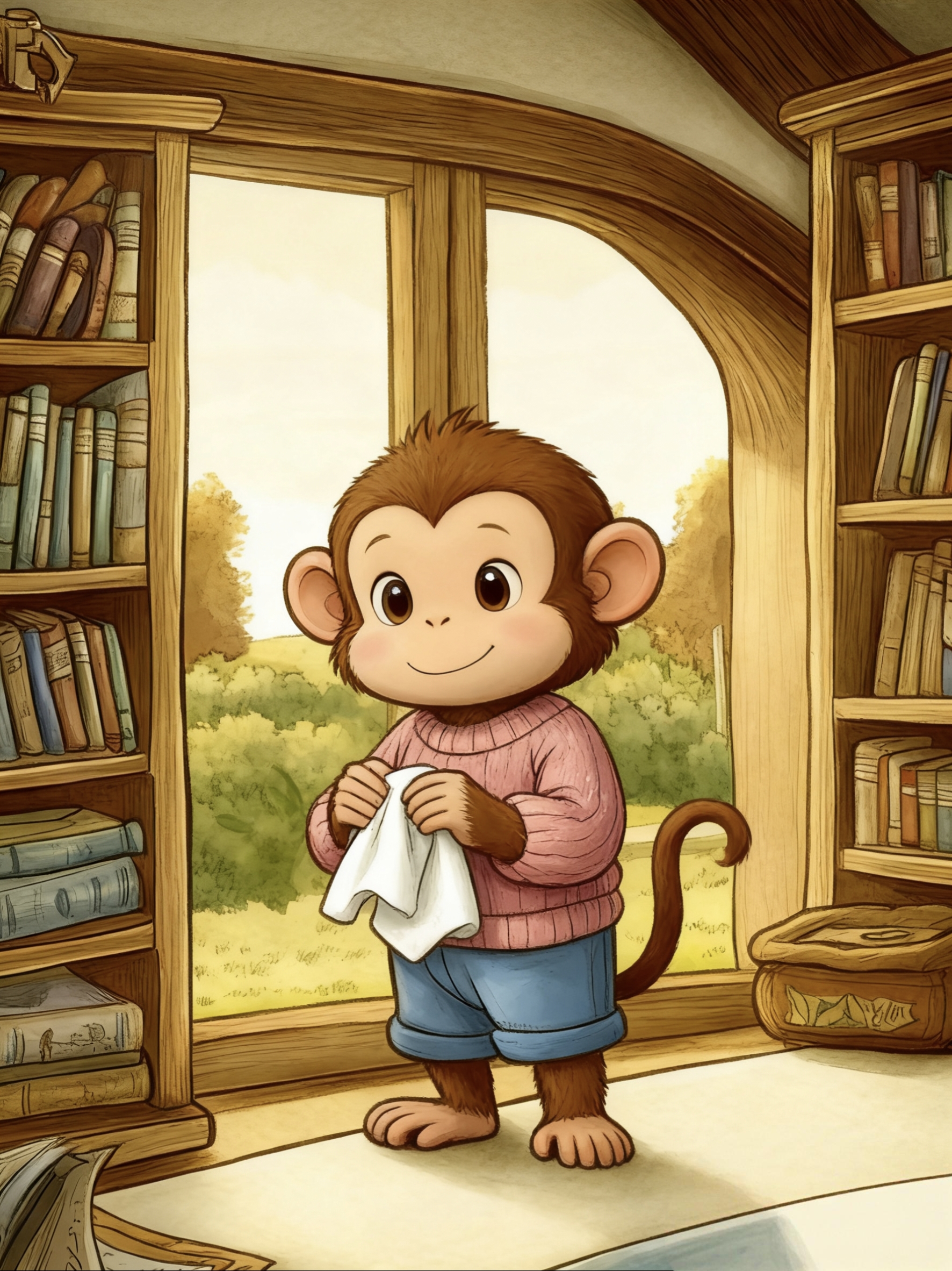 从那以后,小猴子齐齐看完书会用布擦净、检查折角,再轻轻放回书架摆好。它还常擦书架,如果不小心把书弄脏了一点,它就会小心翼翼地用橡皮擦干净。现在,齐齐的书都干干净净、平平整整的,它们依然每天陪伴着齐齐,给它讲述一个又一个精彩的故事。