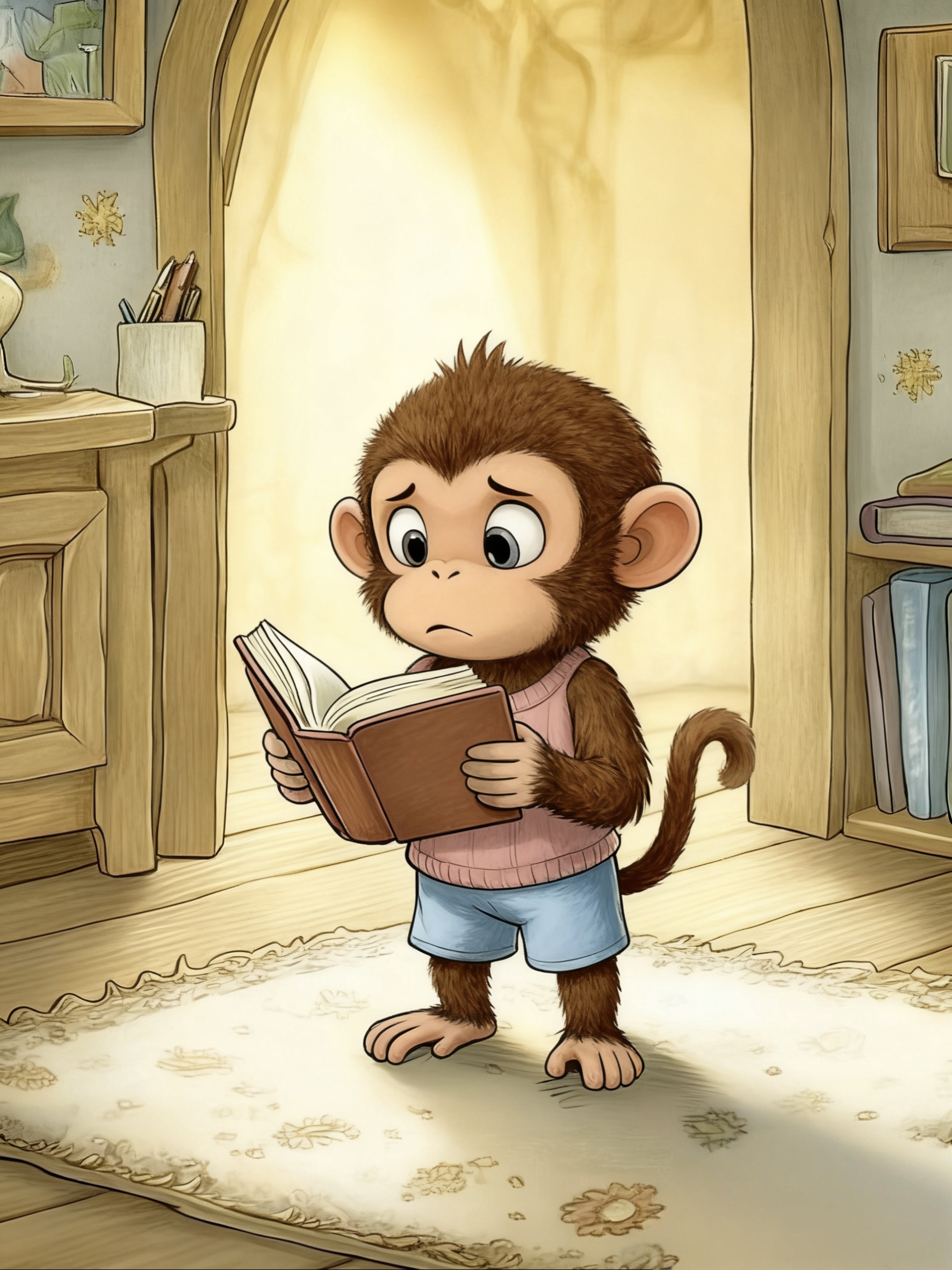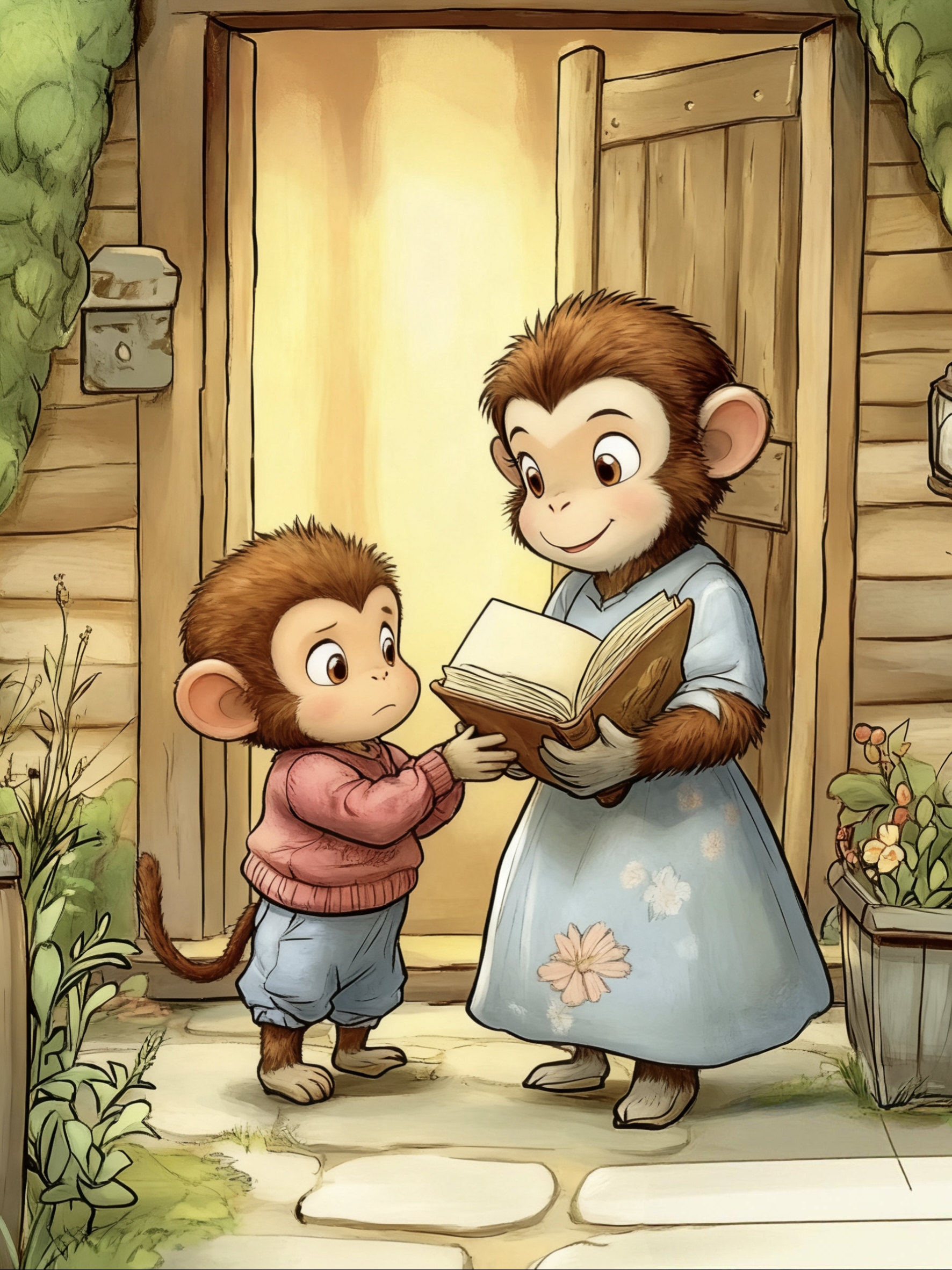 小猴子齐齐看着手中那本惨不忍睹的书,眼泪止不住地流,满心懊悔。它抱着书急忙跑到妈妈房间,哭着喊:“妈妈,妈妈!”妈妈看到齐齐红肿的眼睛和那本破旧的书。接过书,看到损坏的样子,无奈地叹气。妈妈摸摸齐齐的头说:“宝贝,书是我们的好朋友,里面有奇妙世界、有趣故事和知识。你乱丢乱涂,让它受伤,不能好好给你讲故事了。”小猴子齐齐听后羞愧难当,想起新书的整洁漂亮,意识到错了。
