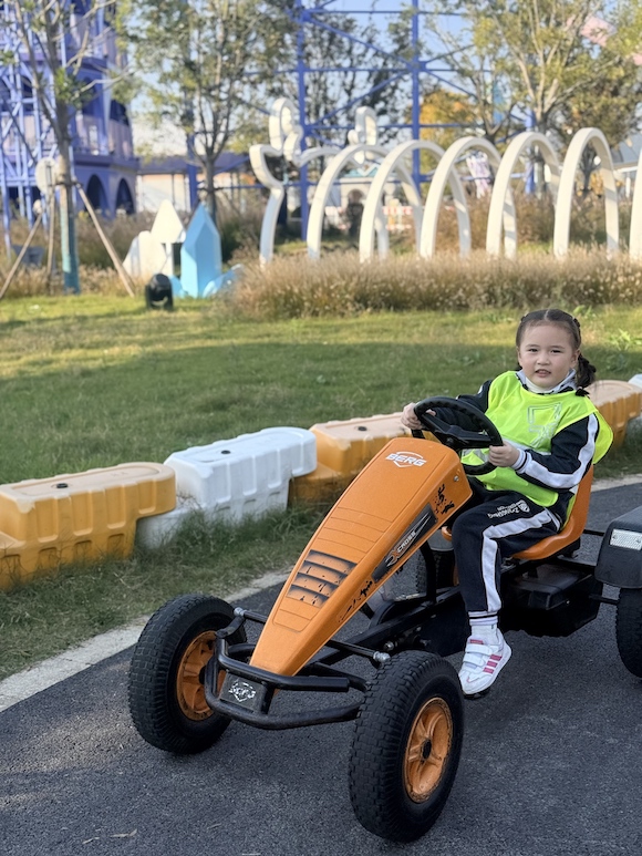 卡丁车赛道上,孩子们驾驶着橙色的小车,体验着速度与激情。他们专注地握着方向盘,眼神里闪烁着兴奋与挑战的光芒。