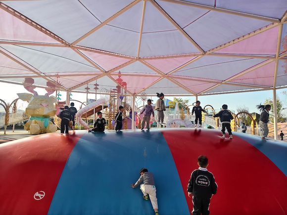 大型蹦蹦床上,孩子们像快乐的小鸟一样跳跃、飞翔。他们互相追逐、嬉戏,整个乐园都被他们的欢笑声填满。