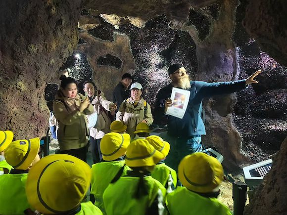 走进东海水晶博物馆,仿佛踏入了一个流光溢彩的梦境。在昏暗的洞穴展区,外教老师张开双臂,用富有感染力的手势,将孩子们的目光引向那些在灯光下闪烁的水晶簇。他的眼神中闪烁着热情与专注,仿佛在为大家揭开一个个自然的奥秘。