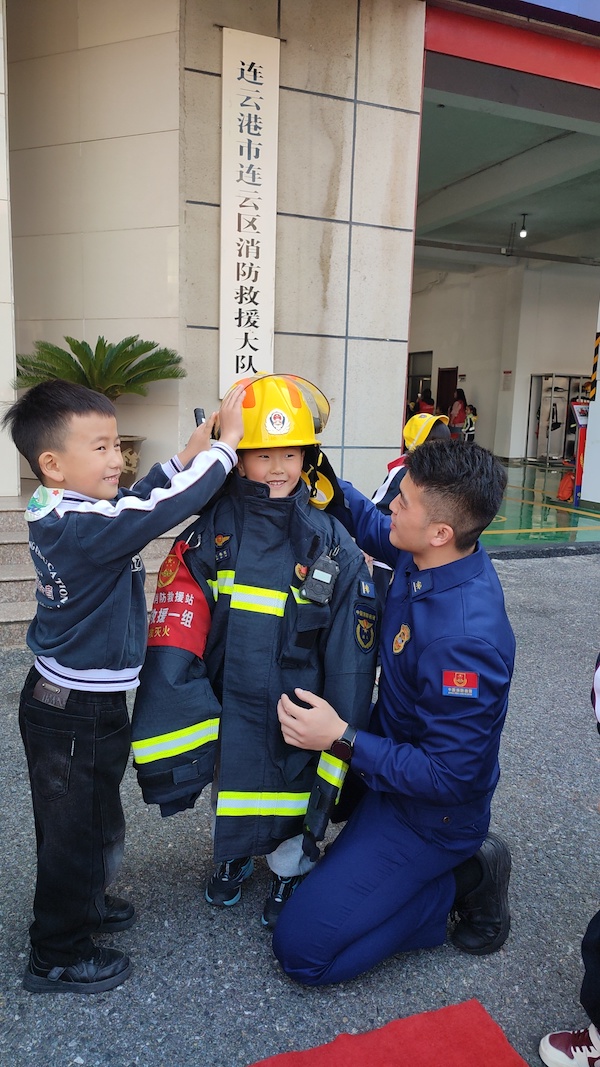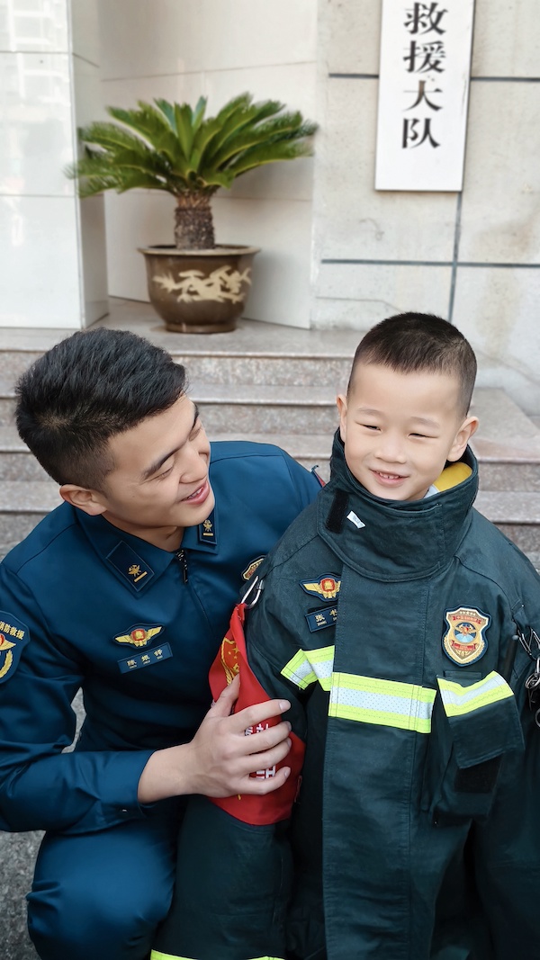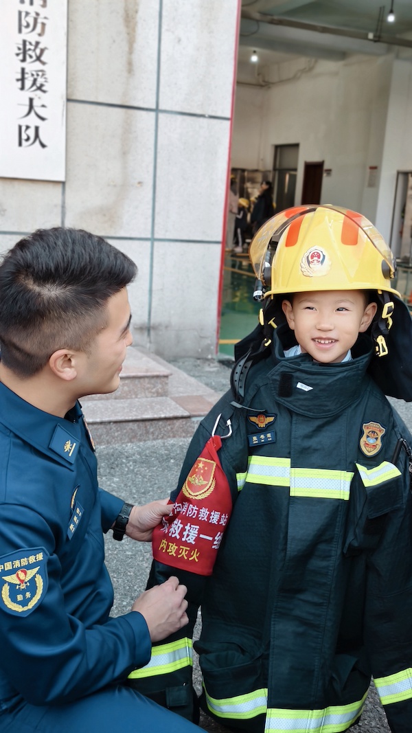 小小身影裹进厚重的消防服,明黄色头盔衬得笑脸更甜。消防员叔叔弯下腰,细致调整着宽大的肩带——那身能挡烟火的“铠甲”,此刻裹满了温柔的守护。