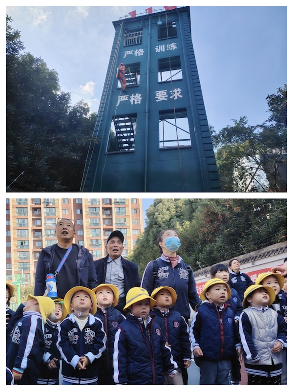 训练塔上,消防员如飞燕般利落攀爬——“严格训练、严格要求”的标语旁,那抹橙色身影是最生动的注脚,连风都跟着绷紧了神经,却被孩子们仰起的小脸上亮晶晶的崇拜揉软了。室内的地板上,蓝制服弯成温柔的弧度:消防员叔叔指尖起落间,方方正正的被褥像被施了魔法,连小朋友们都屏住呼吸,把“厉害”两个字悄悄攥进了攥紧的小拳头里。