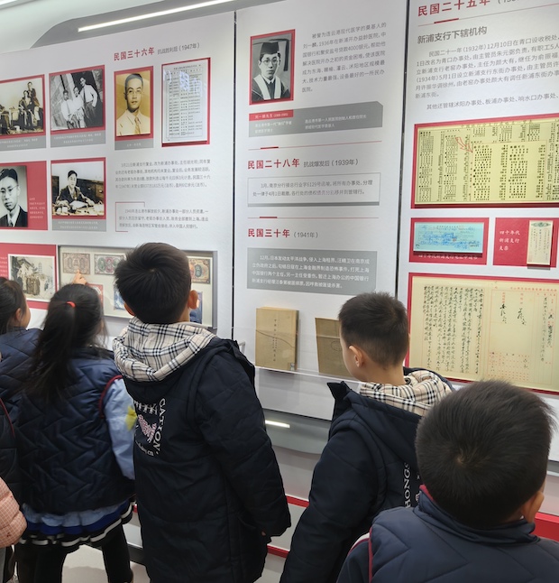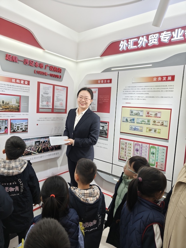 孩子们走进中国银行的历史展厅,工作人员面带笑容,手持资料生动讲解着银行的发展历程与外汇外贸的专业知识。孩子们纷纷仰着小脸,目光紧紧追随着讲解员,有的孩子微微踮起脚尖,眼睛瞪得圆圆的,好奇地打量着展墙上的老照片与历史文献;有的孩子抿着嘴、皱着小眉头,仿佛在努力消化这些新奇的知识;还有的孩子忍不住微微歪头,小脸上写满了对过往金融故事的探究,一个个稚嫩的身影里,满是对未知世界的向往与专注。