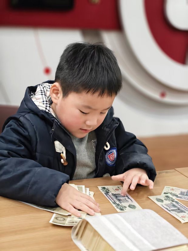孩子们专注地探索着钱币上的图案奥秘,此时,小男孩微微俯身,眼睛紧紧盯着桌上的纸币,手指轻轻点着钱币上的纹样,眉头微蹙,小嘴巴抿着,一副认真研究的模样;戴眼镜的小朋友则端坐桌前,小手捻着纸币边缘慢慢翻动,目光专注地扫过钱币上的图案,指尖还时不时停顿在感兴趣的花纹处,稚嫩的脸庞上满是探究的神情,仿佛在解锁藏在钱币里的小秘密,每一个认真的小动作,都透着对未知知识的好奇与渴望。