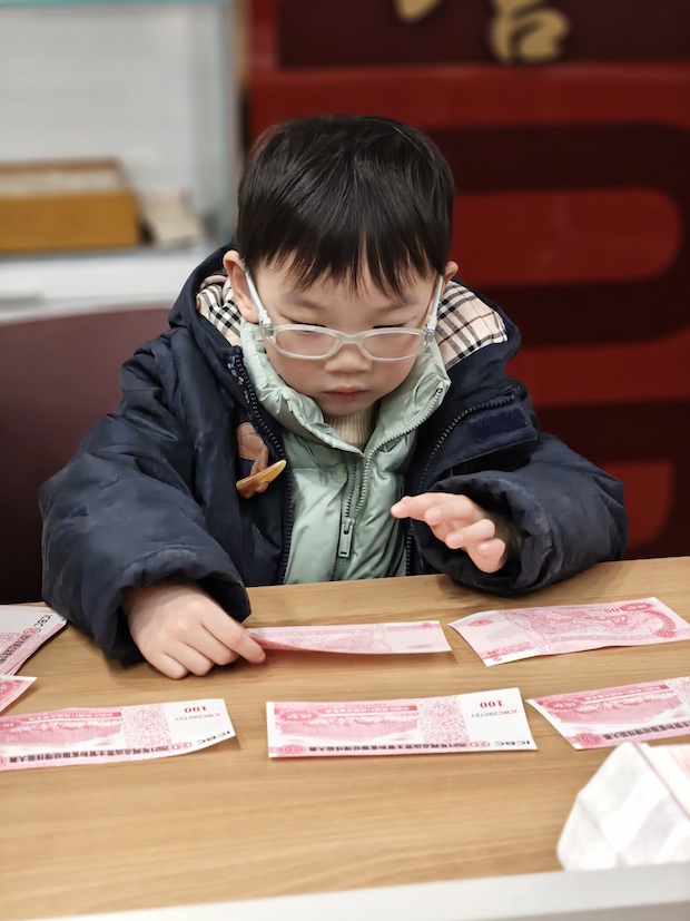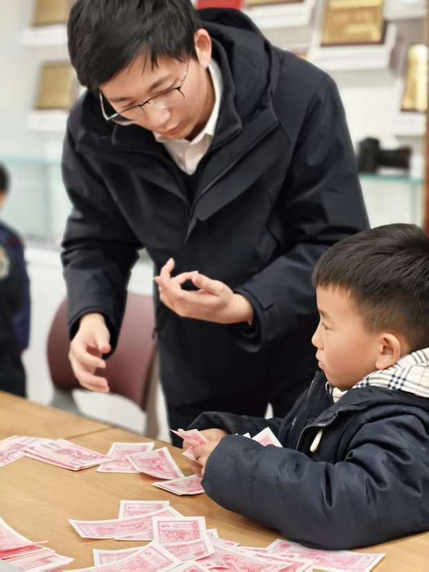 孩子们在中国银行研学之旅中,迎来了趣味十足的点钞体验环节。银行工作人员俯身靠近孩子,手把手地教他们点钞的手法:指尖轻柔地帮孩子捏稳纸币,耐心调整着他们手指的姿势,嘴里还轻声讲解着技巧。孩子们的小脸上满是专注,眼睛紧紧盯着手中的纸币,小手指笨拙又认真地跟着比划,有的孩子慢慢找到节奏后,嘴角偷偷扬起,露出得意的小表情;小女孩更是睁着圆溜溜的眼睛,跟着工作人员的动作一点点摸索,稚嫩的指尖捻动纸币的模样,满是童真的认真。这温馨的互动瞬间,让金融知识在指尖的触碰里变得生动又温暖。