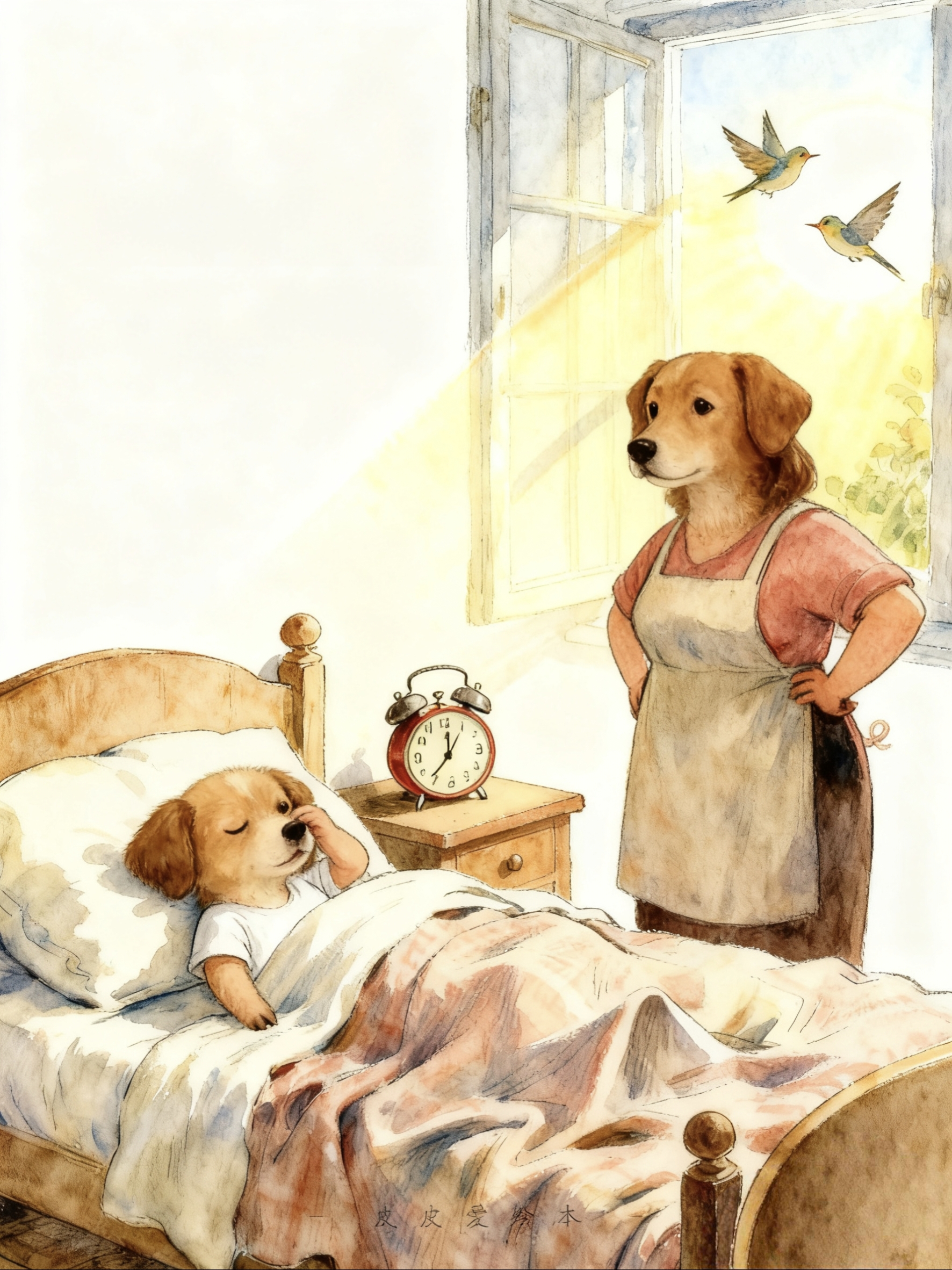 叮铃铃!太阳公公起床啦,可我们的小狗仔仔,还在被窝里做着甜甜的梦。 “仔仔,快起床哦!再不起床,上学就要迟到啦!”妈妈轻声说。仔仔揉揉眼睛,嘟囔着:“再睡一分钟,就一分钟……”一分钟,两分钟,三分钟……仔仔做任何事情,都像是电影里的慢动作。