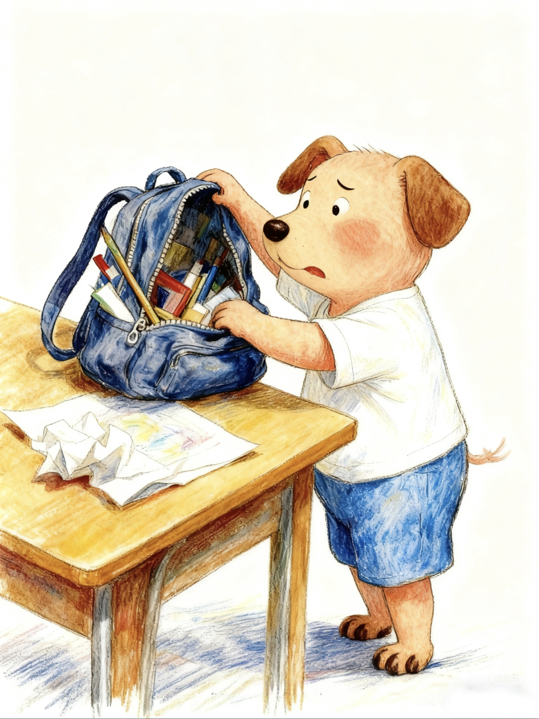 美术课上,仔仔着急的找画笔,哎呀,都怪早上太着急,书包里什么都乱糟糟的。仔仔在心里默默地想:“我不要再迟到了!拖拉真是个坏朋友,我要和它说再见!”