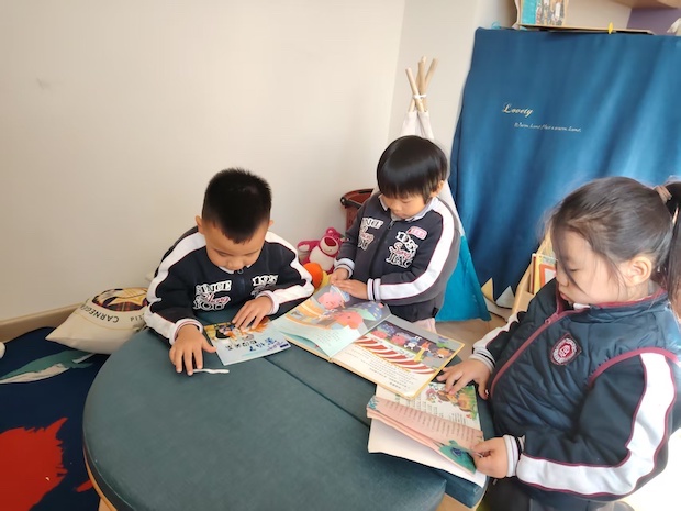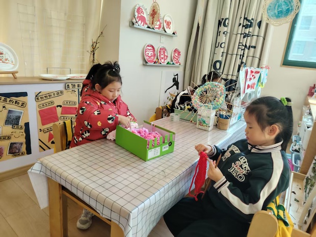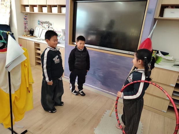 大班的教室里,是孩子们肆意生长的童趣天地。特色织毛线区,宝贝们端坐桌前,稚嫩的手在毛线间穿梭出温柔的弧度;建构区的小小建筑师们围坐地垫,弯腰挑拣、合力拼接积木,嘴角挂着合作的笑意,积木在手中渐渐搭起童话城堡;阅读角的宝贝们依偎在一起,小手点着绘本画面,目光沉醉地追着故事走;亲子戏剧区更热闹,孩子们手持道具、化身小演员,灵动的眼神,将童趣与想象揉进每一段表演;多元的区域活动,把童年的美好揉进每一个专注的瞬间,让成长在趣味探索里悄然发生。