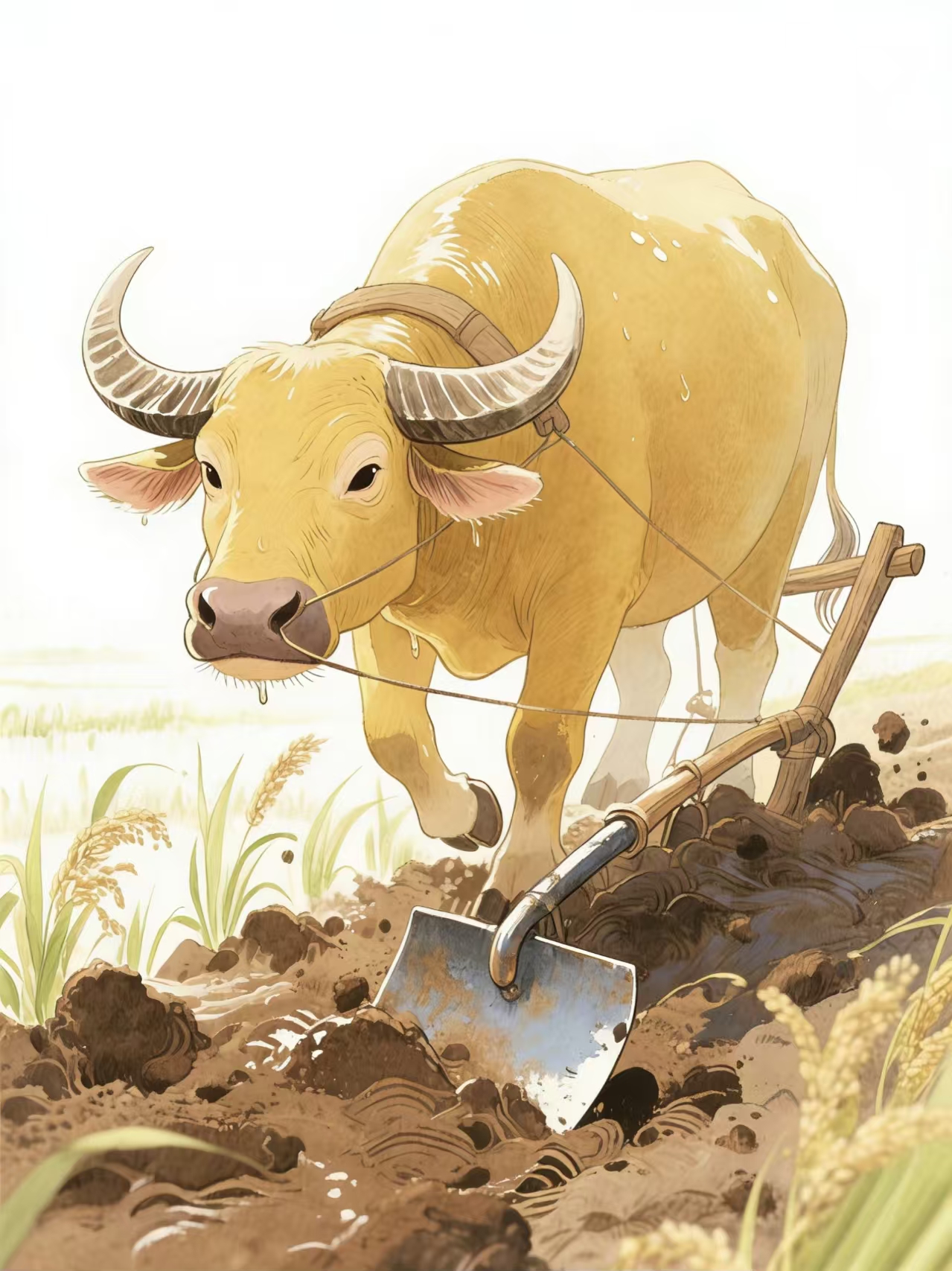 “仔仔,跟妈妈来。”妈妈不知什么时候站在了身后,满脸不赞同的看着仔仔。妈妈牵着仔仔的手来到了村外的稻田里。黄牛伯伯正拉着犁耙在翻地,阳光把它的脊背晒得油光发亮,汗珠滴在泥土里。