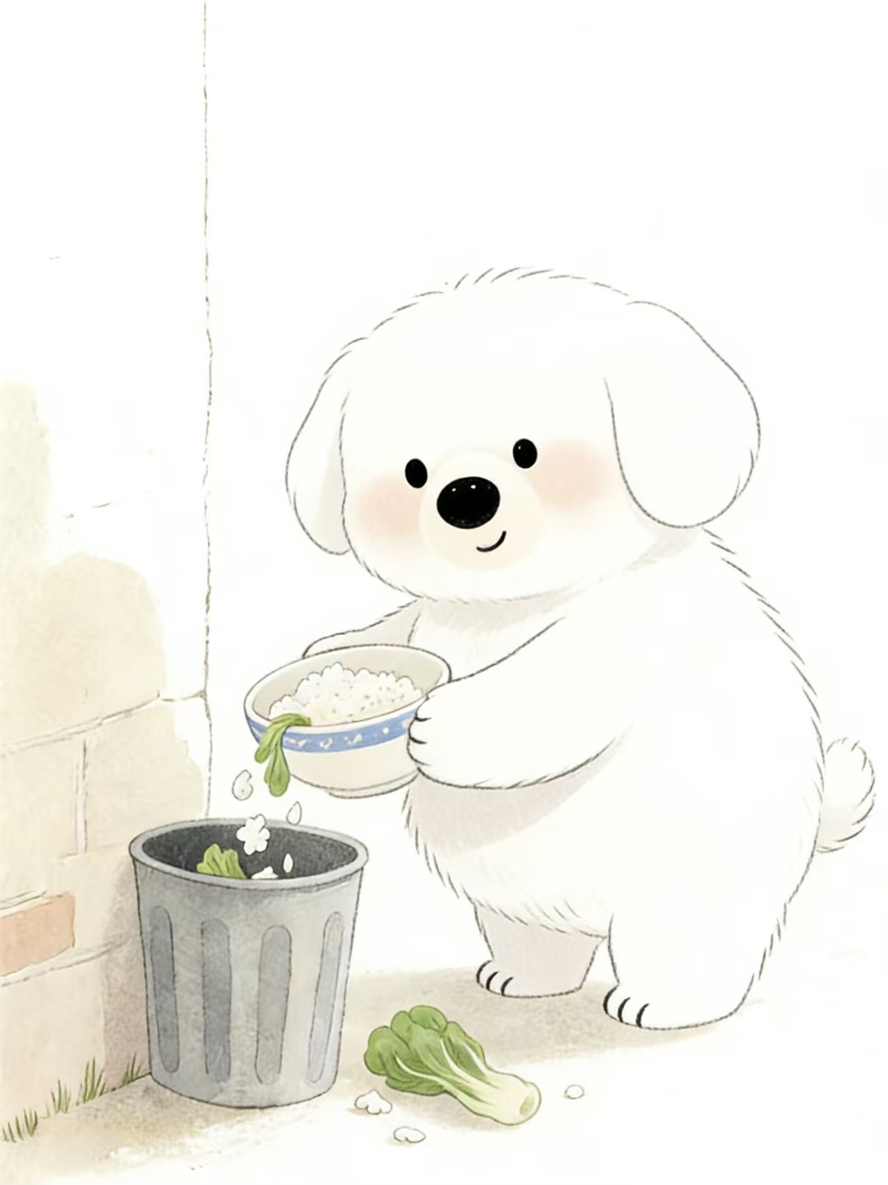 仔仔用勺子戳着碗里的米饭,看着桌上的青菜,眉头皱了起来:“米饭青菜不好吃,我不想吃!”趁妈妈仔仔在厨房忙,它端起碗把饭菜倒进了垃圾桶。