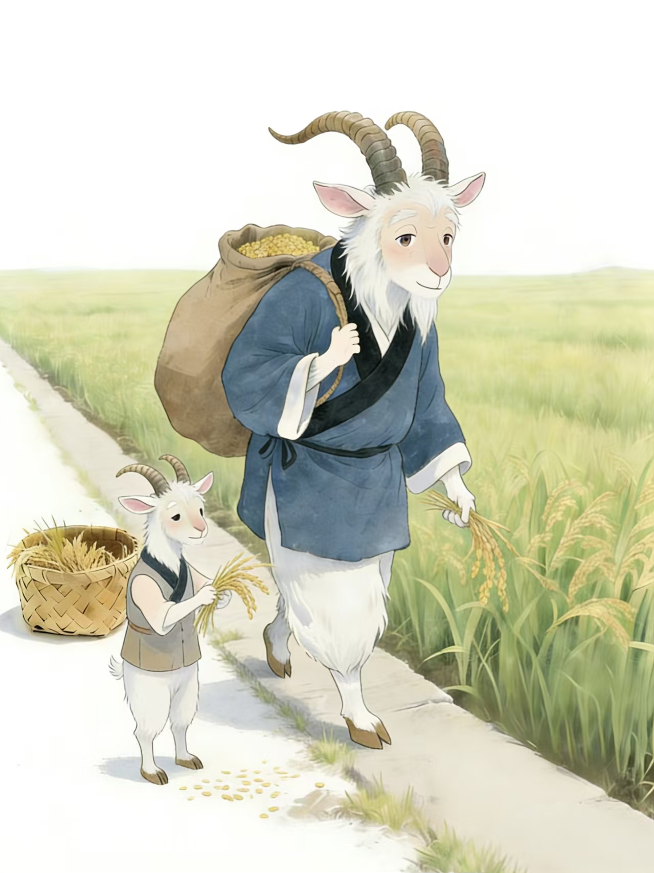 往前走,黄狗阿姨正弯着腰插秧,水田里的泥巴没过了它的小腿。仔仔还看到山羊爷爷背着沉甸甸的稻谷袋,一步一晃地走着,小山羊把掉在地上的稻穗捡进竹筐里。