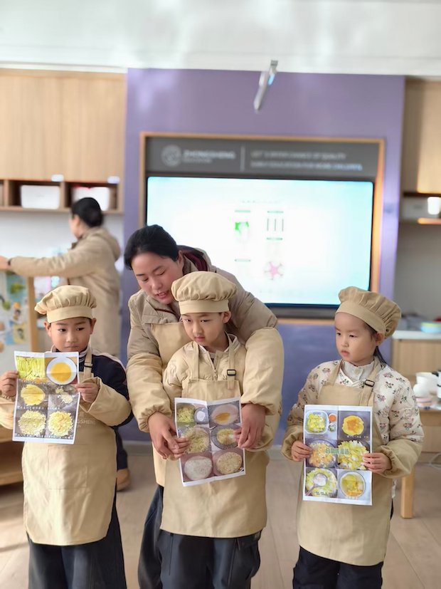 老师温柔地俯身向前,双臂轻轻搭在中间孩子的肩头,目光与孩子的视线落在一起,共同聚焦在那张印满美食的食谱卡上。她嘴角噙着浅浅的笑意,眼神里满是鼓励与陪伴的温柔,仿佛在轻声说着:“我们一起来看看,今天要做什么好吃的呀?”老师与孩子之间的互动自然又亲昵,她的俯身与轻搭的手臂,传递出满满的安全感,让整个画面都流淌着温暖的师生情谊。不远处的青海老师们静静看着这一幕,眼里也漾起了温柔的笑意,在烟火气里,一场关于爱与美食的联结正在悄然发生。