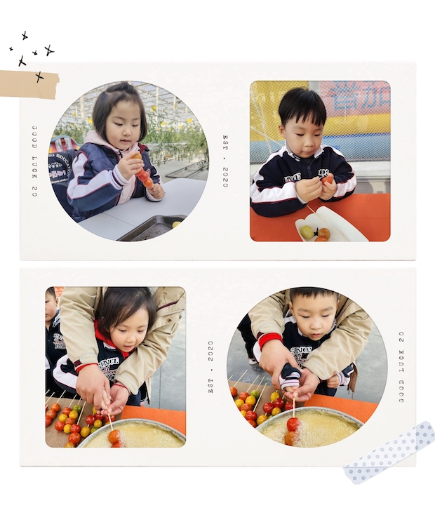 刚摘下的小番茄摇身一变,成了孩子们手里的甜蜜原料,小宝贝们捧着红黄绿的果子,用竹签一颗颗串起,小手指捏得稳稳的,仿佛在完成一件了不起的艺术品。在老师的温柔帮助下,串好的番茄串轻轻浸入冒着细密气泡的金黄糖浆里,孩子们仰着小脸屏息凝视,看着透明的糖衣裹住饱满的果子,眼睛里亮闪闪的全是期待。当裹好糖衣的番茄串递到手中,他们迫不及待地凑到嘴边,轻轻咬下一口——脆甜的糖壳在嘴里裂开,混着番茄的微酸,满足的笑容瞬间漾开在红扑扑的小脸上。有的宝贝眯起眼睛细细品味,有的还不忘举着串比个“耶”,清甜的香气和欢声笑语交织在一起,让整个午后都变得暖洋洋的。