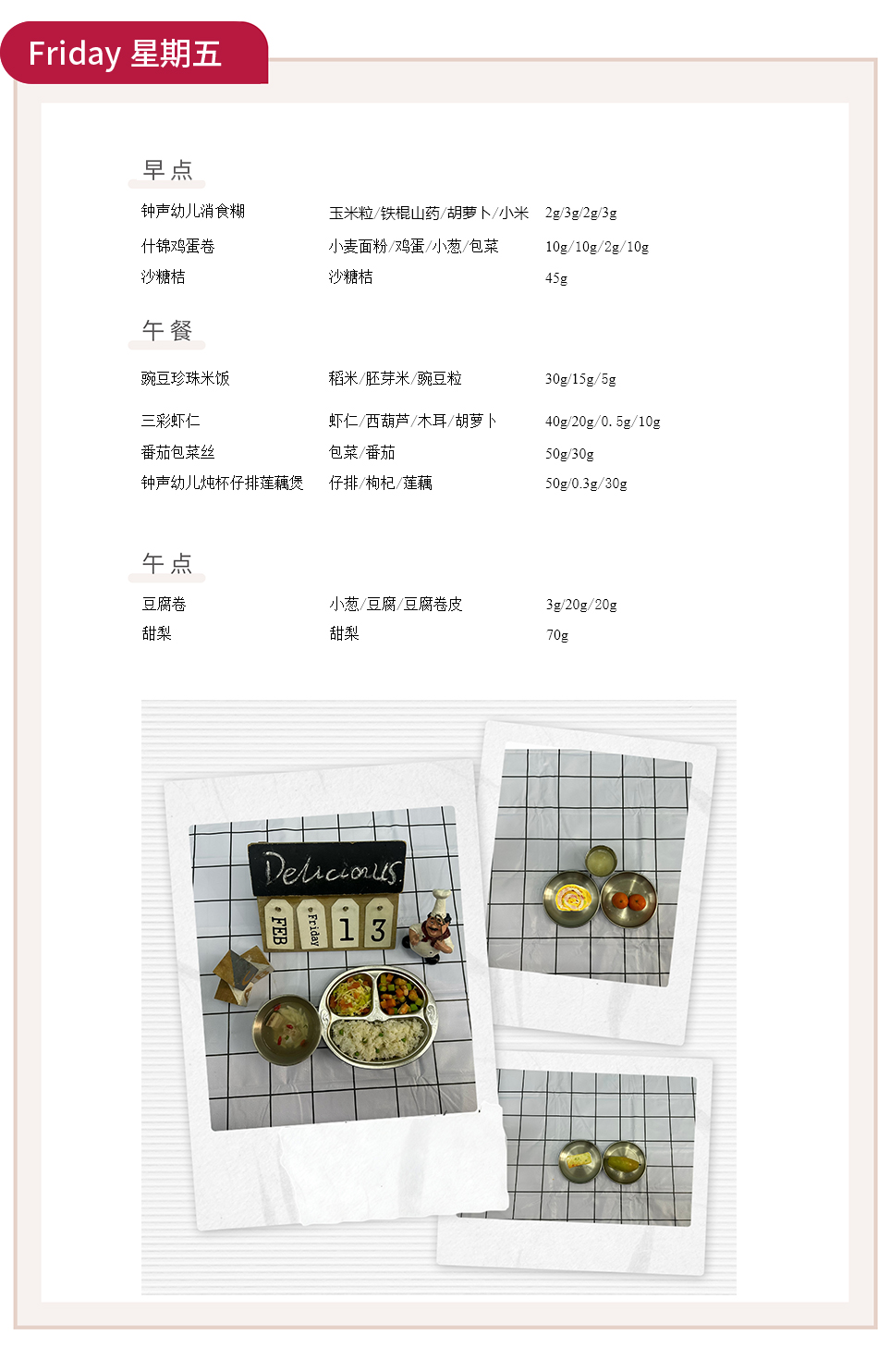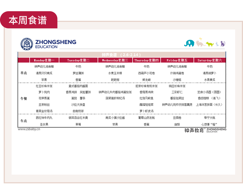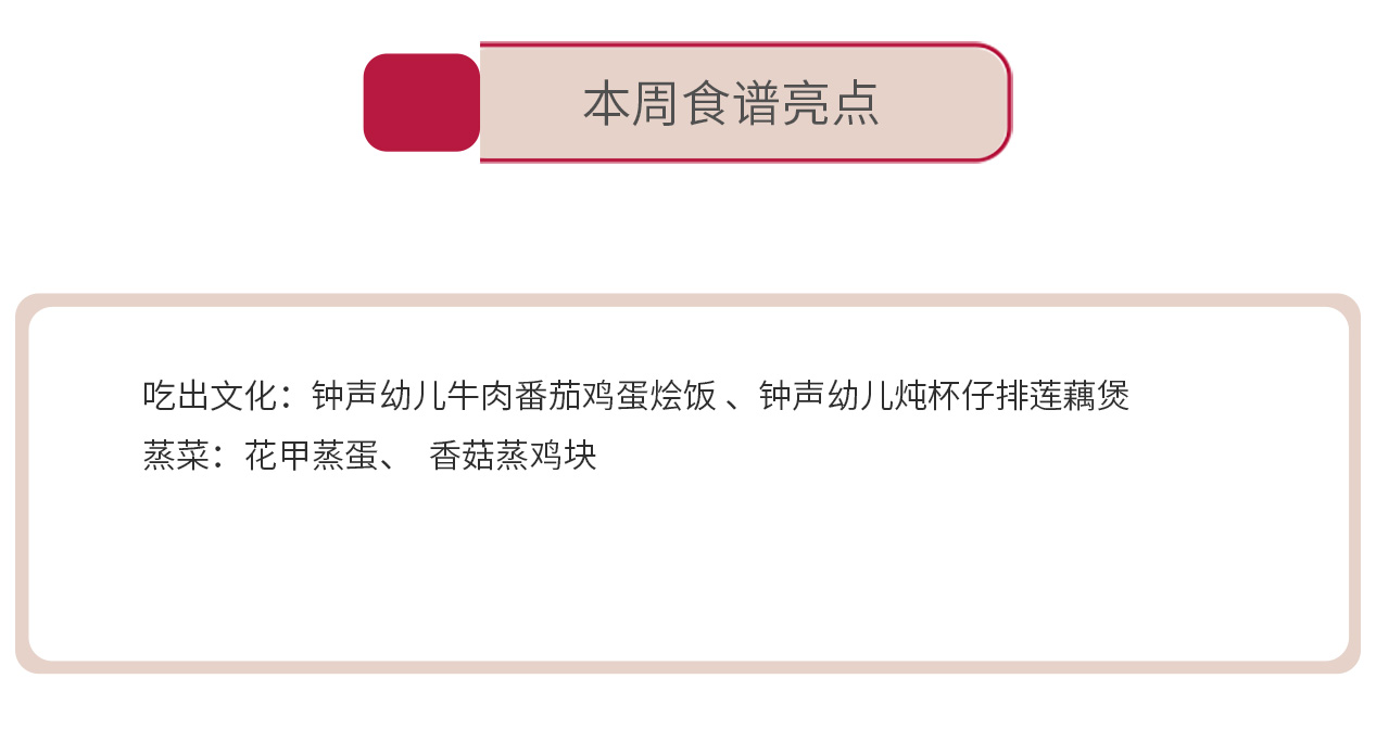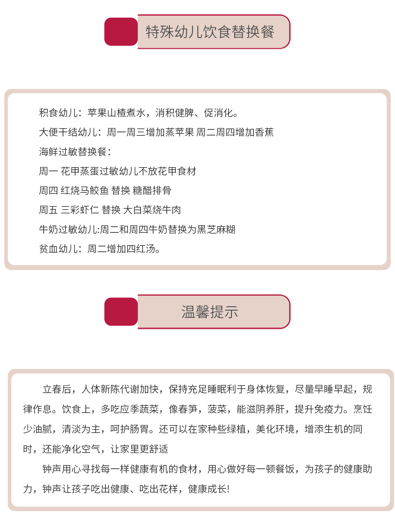 本周(2.6-2.14)的食谱已新鲜出炉啦!这段时间正值立春节气,万物复苏,阳气生发,我们的食谱也顺应时节,为孩子们精心搭配了温润、易消化的食材,助力他们在春日里健康成长。