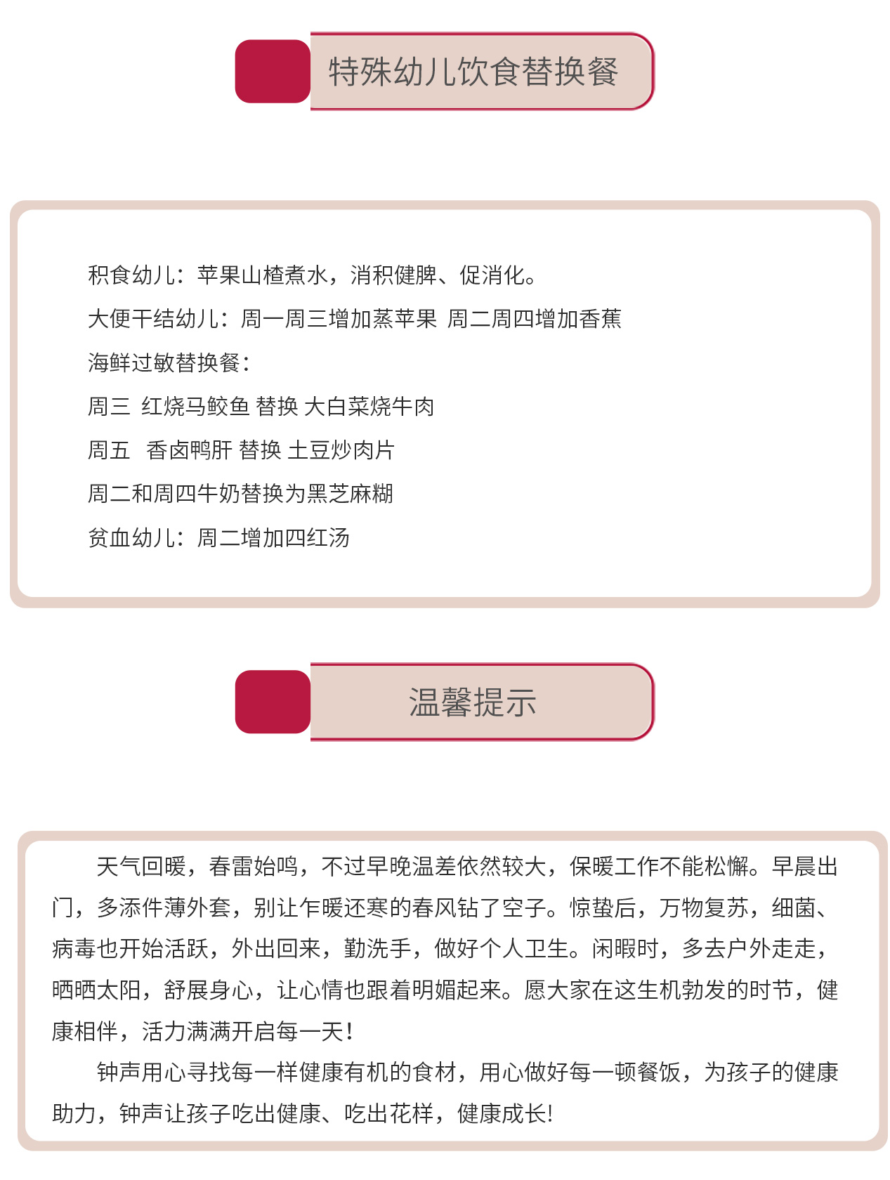 健康呵护:特别准备了钟声儿童消食糊,帮助孩子调理脾胃;食材选择软烂易嚼,适合幼儿咀嚼和消化。