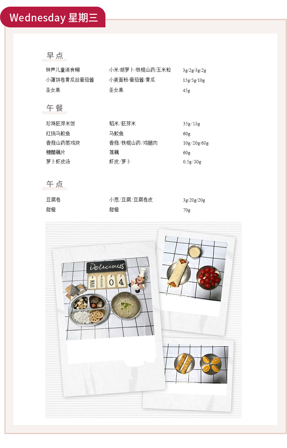 - 周三:钟声儿童消食糊 + 小薄饼卷黄瓜丝番茄酱 + 圣女果