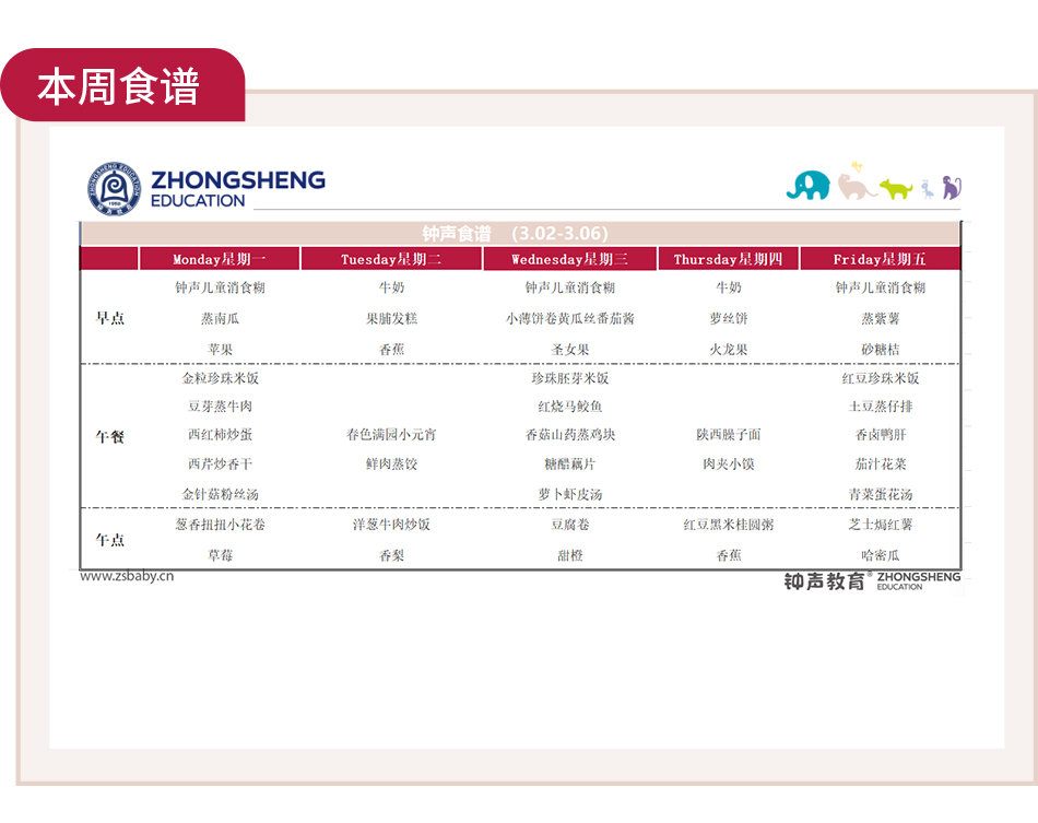为了让宝贝们在园吃得营养、健康又美味,我们精心制定了本周(3.02-3.06)的膳食计划,遵循科学搭配、均衡营养、口感适宜的原则,为孩子们提供一日一餐两点的美味膳食。