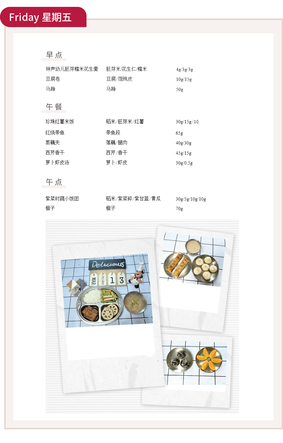 - 周五:珍珠红薯米饭 + 红烧带鱼 + 蒸藕夹 + 西芹香干 + 萝卜虾皮汤