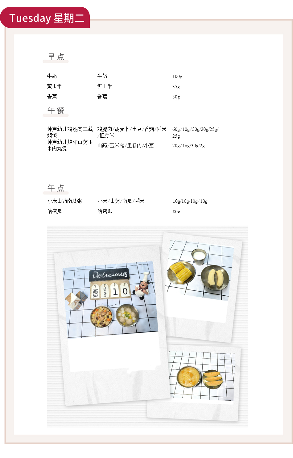 - 周二:小米山药南瓜粥 + 哈密瓜