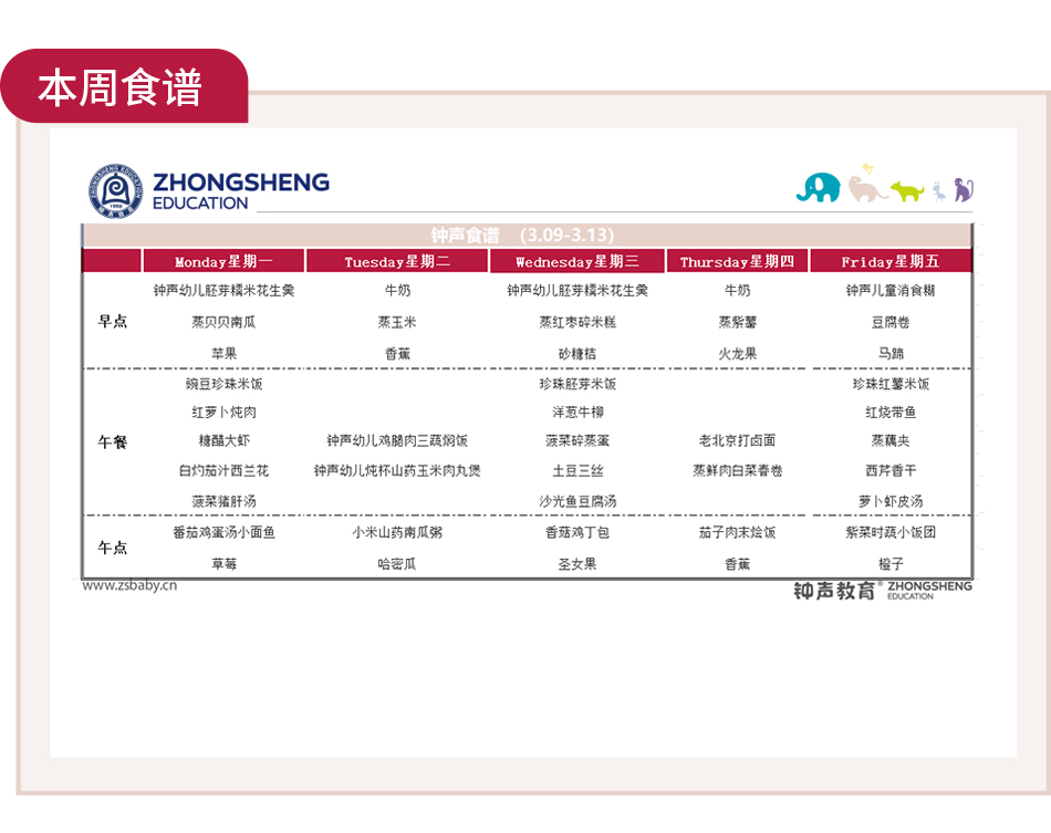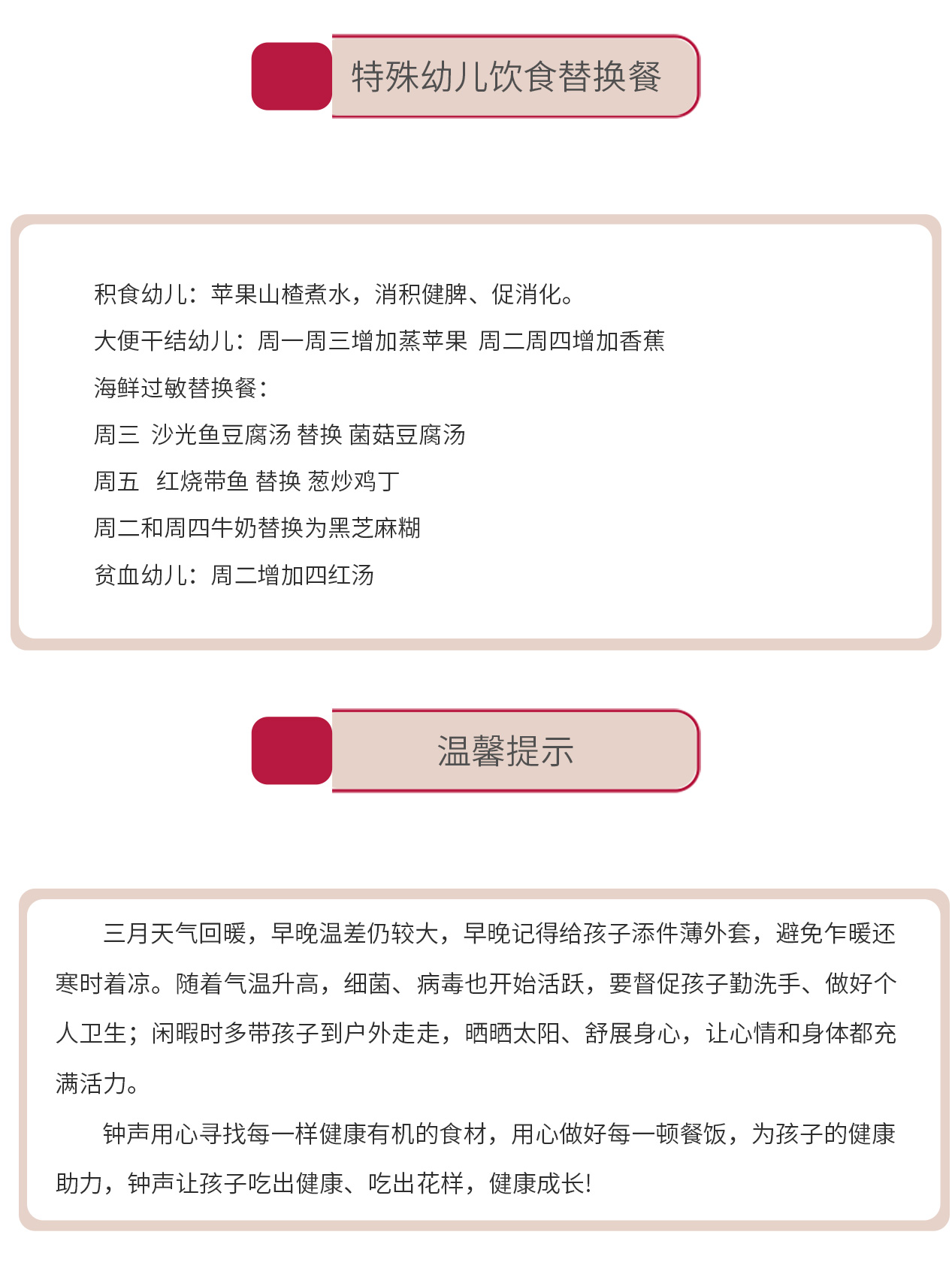 本周(3.09-3.13)的食谱,遵循清淡易消化、营养多样化、食材新鲜,让孩子们在幼儿园吃得美味又健康。