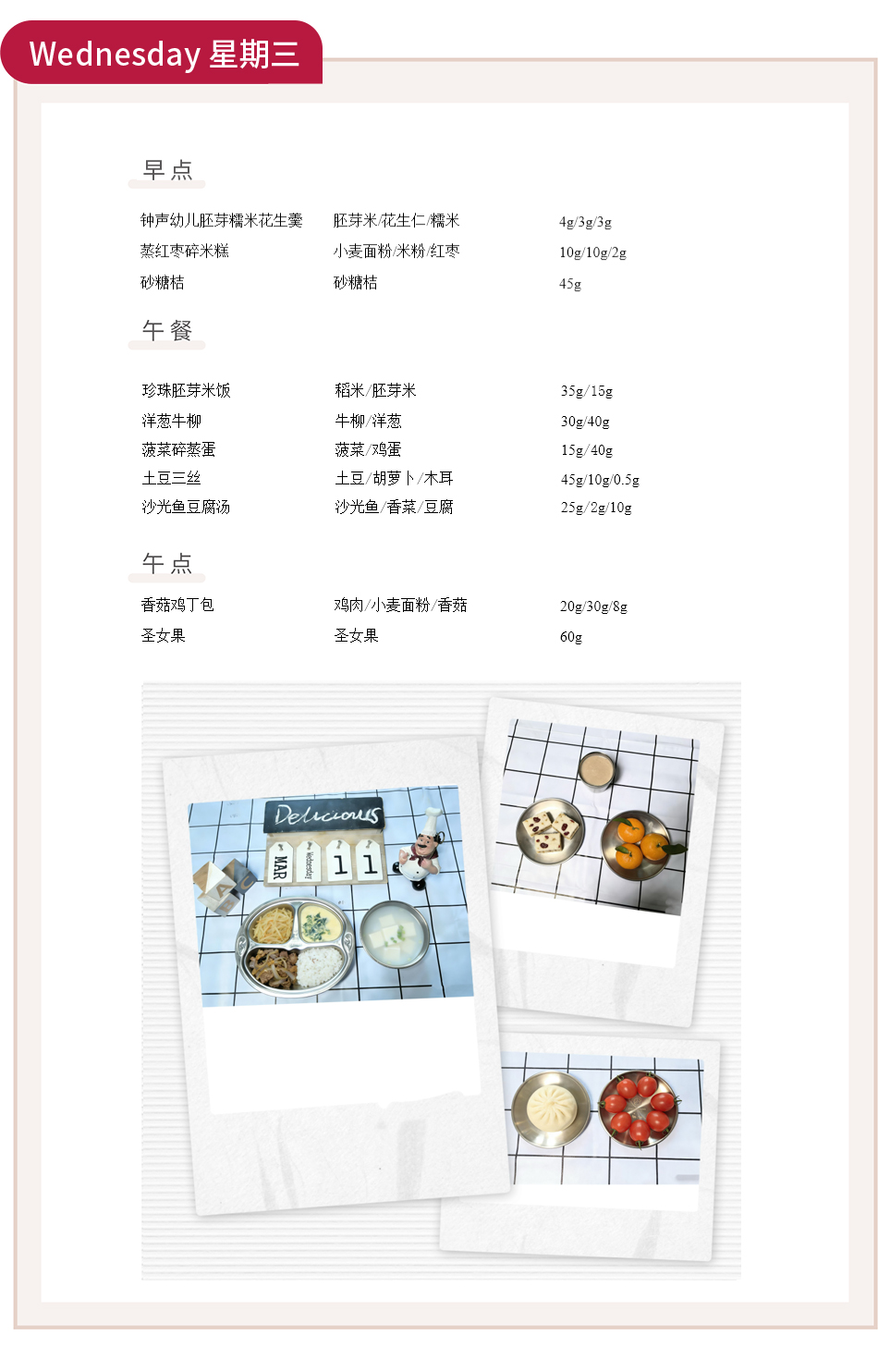 - 周三:钟声幼儿胚芽糯米花生羹 + 蒸红枣碎米糕 + 砂糖桔