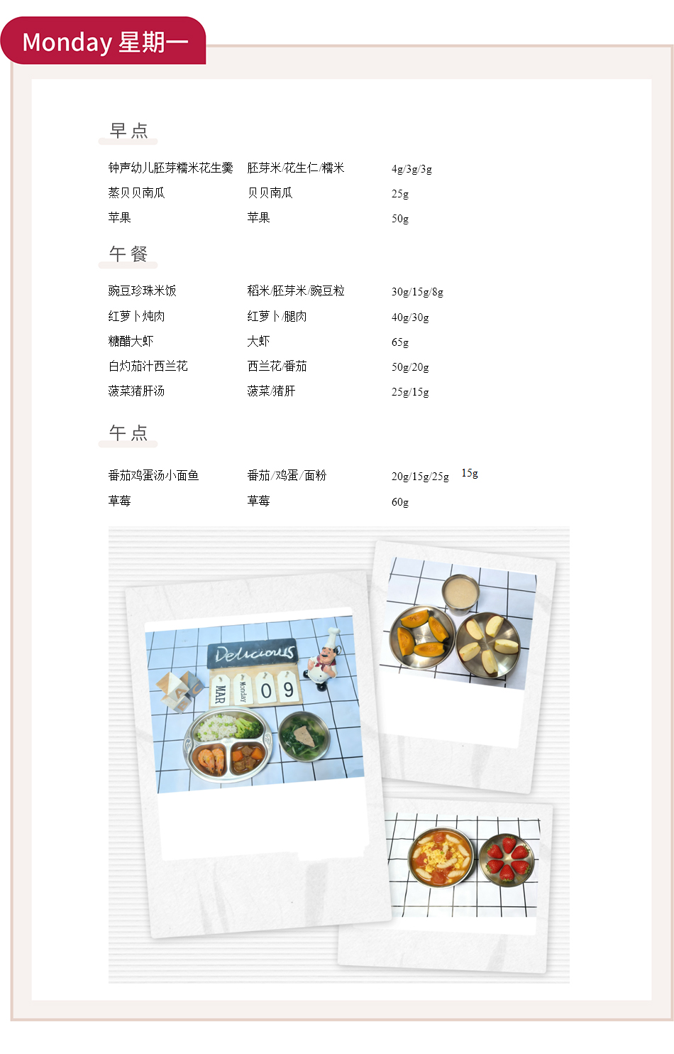 - 周一:钟声幼儿胚芽糯米花生羹 + 蒸贝贝南瓜 + 苹果